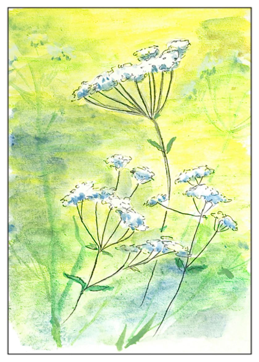 I didn’t set out to do too much – but in the end, it worked out pretty good. I kept in mind light to dark. I also kept in mind working over the whole painting, shifting back and forth from one area to another, and applying a hairdryer when things needed to dry out a bit more than my patience was willing to wait for. All of a sudden, I swear, my mind said, “Hey, let’s paint around these flowers!” There were not any flowers in that area, but I did negative painting without too much thought. Wow! That was a big shift for me – I’m still quite the newby in this area.