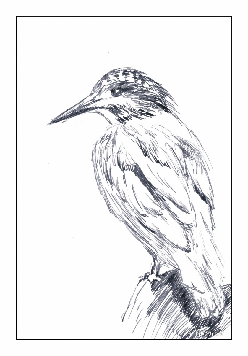 This morning I did a quick sketch of a kingfisher using iron gall ink using a dip pen. As you can see, there is a bit better variability in lines than when drawing is done with a quill pen (see yesterday’s post). Both have qualities I really like – expressiveness, boldness, delicacy. As I am used to using fountain pens, a dip pen is no problem once I learned how to control the amount of ink on nib. What must be remembered is how to load the nib, and as nibs are all different, a bit of testing on scratch paper helps.