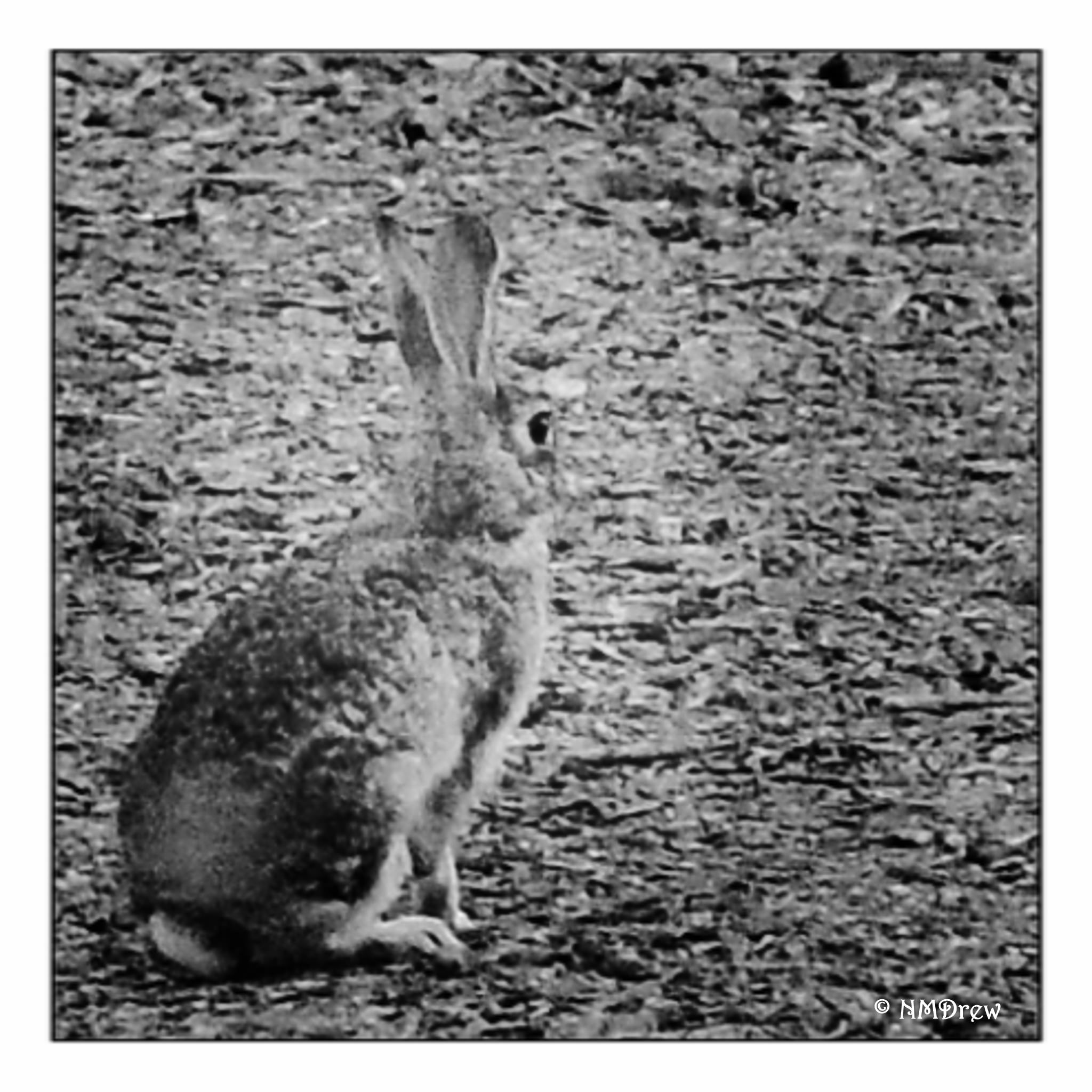 This is a small, small bit of a larger image – only when I started looking carefully did I see this little bunny. He was against a beige-grey background, just like him. Only when he hops away do you see his flashy white tail. I read somewhere that the bunnies in our area run away from predators, who follow the flashy white spot on their rumps, and then, when they think they are safe, the bunnies turn sideways, blending into the background. Silly predator keeps on running!