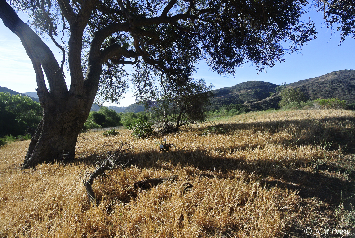 The contrast of light and shadow is so delightful in the early morning. And so different than the evening. Because we were along the creek, the scrub was dense, and so was the foliage. The light through the leaves was really beautiful. Eventually, we moved away from the creek, and found ourselves in a more typical (to my way of thinking) California landscape in the back country – grasslands and oak trees between scrubby hills.
