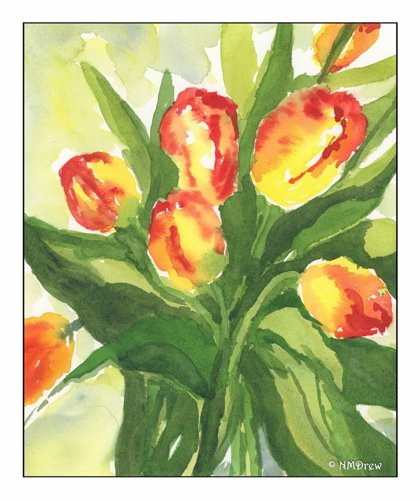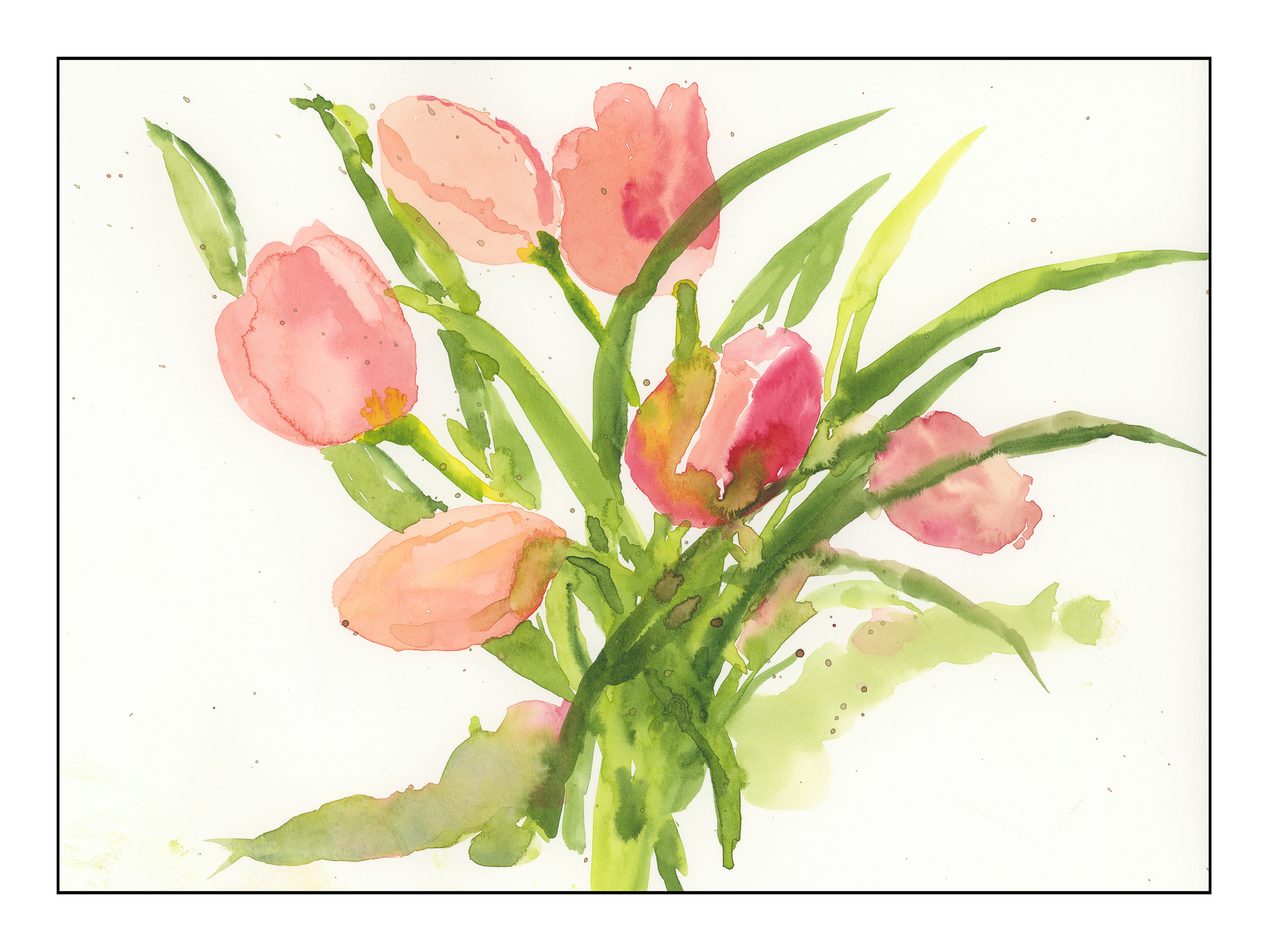 Working with white space is my biggest challenge, so I decided to lay in colors as a first step, as you can see above. The idea here was to work around the white flowers and do what I could to keep them white.