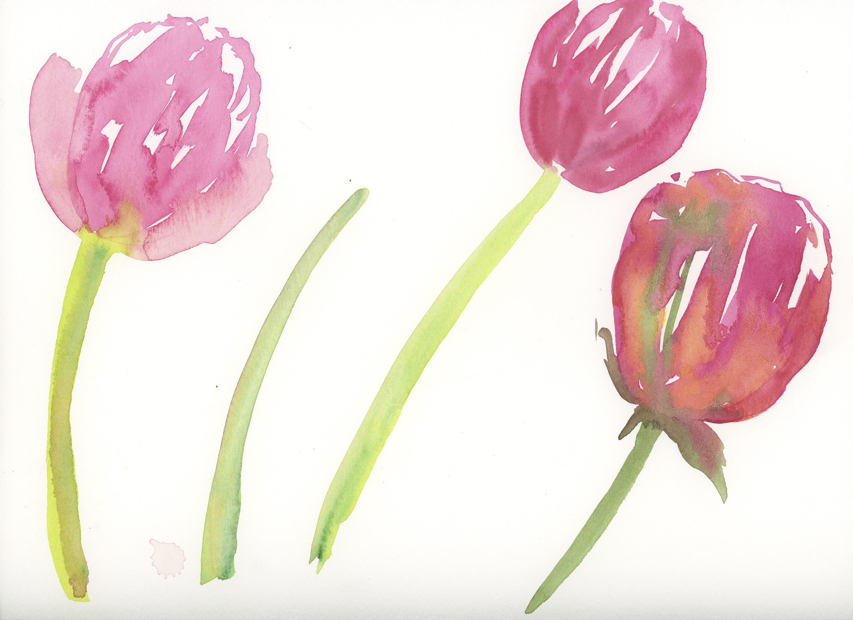 Flowers make sense for the silhouette and then move in to blend colors. Above, wet-on-dry. Also, working directly while everything is still wet – as in the tulip on the far right.