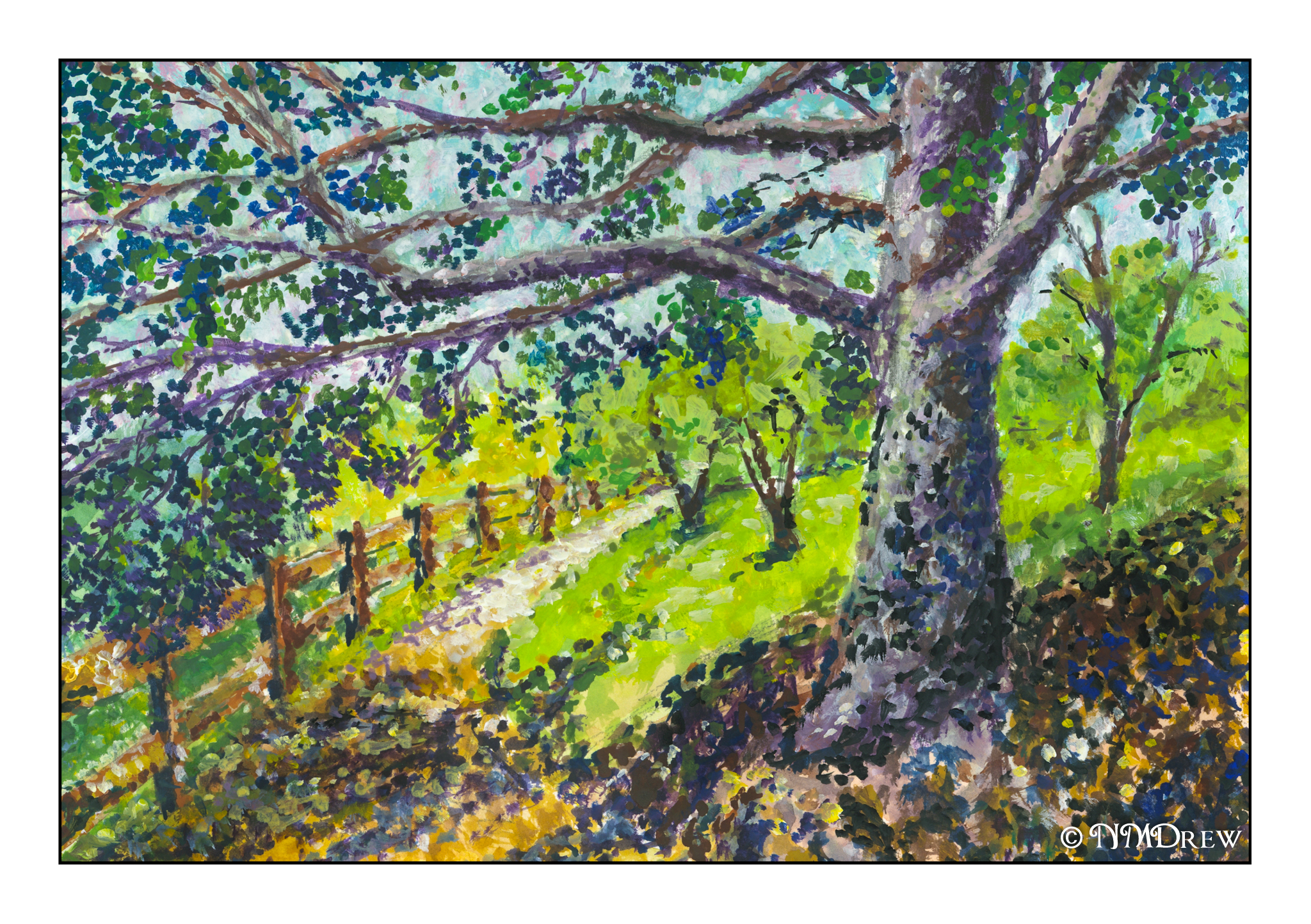 My goal this morning was to simply get out and sketch plein air. Rummaging through my stash of sketchbooks and paper, I found a 6×12 spiral-bound Pentalic watercolor journal, unused. Perfect for landscapes! And for the broad sprawl of the oak tree.