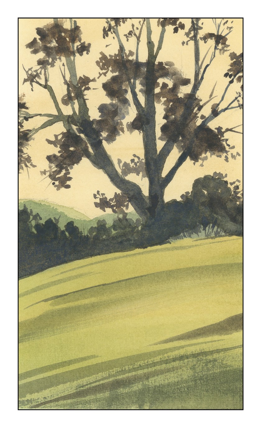 The process here is along the lines of yesterday’s post, and is more successful I think. It is very simple. The steps I took began with a wash on the entire paper (8×10) in raw sienna. The mountains on the left were done next using a bit of sap green with the raw sienna, followed by some cobalt blue for the darker range. After that, the lower half of the painting had a wash of a greenish color, later followed with a darker green of sap green and cobalt blue. The tree and brush in the center were of burnt sienna and cobalt, with perhaps a bit of ultramarine as well.