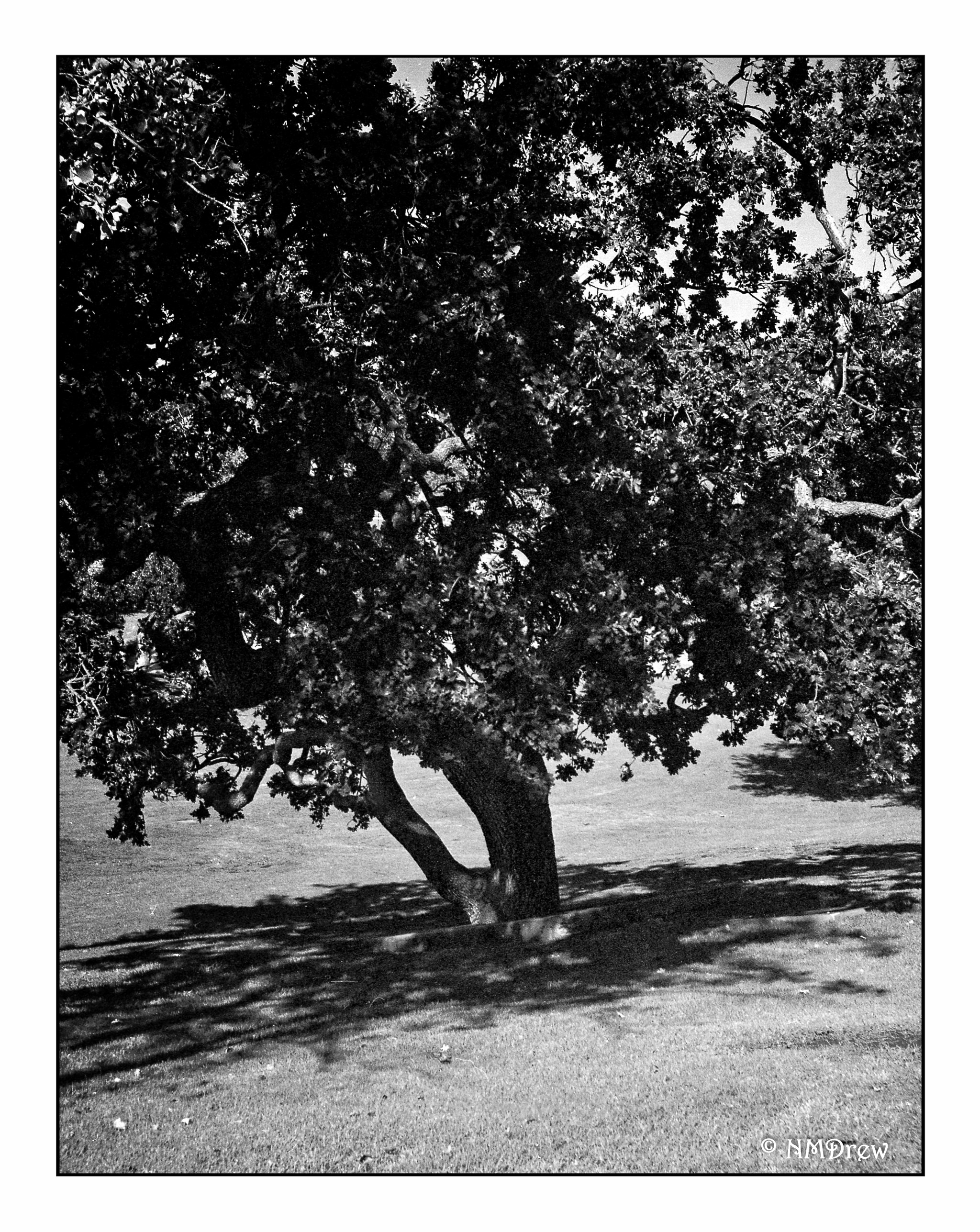 I took this picture awhile back in the local botanical garden. It is an oak against the sky, with the Santa Monica range in the distance. In the photo, the tree is silhouetted against a yellow sky, and the foreground is mottled with dried grasses. The California oak is not deciduous, but shows leaves year round.