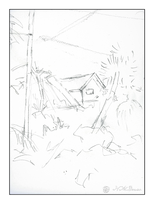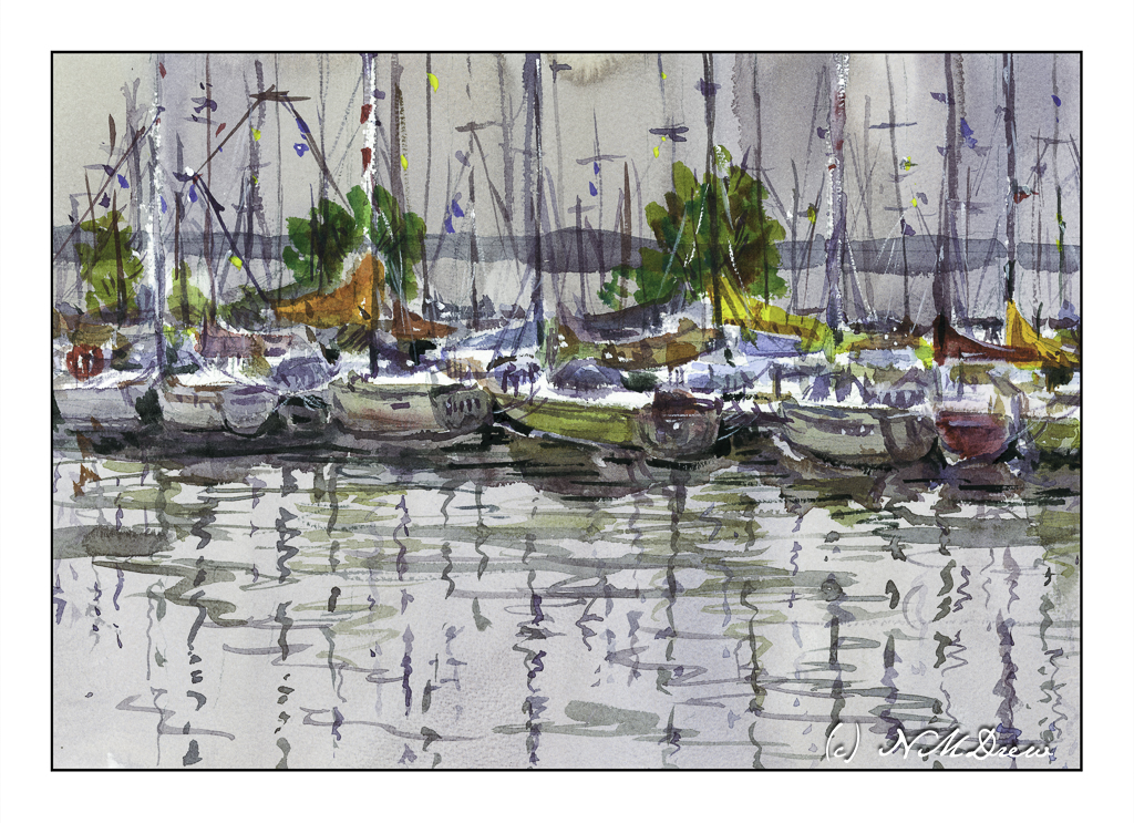 Essentially, the process is very logical and simple. The scene is drawn in pencil. The horizon line is determined, and then the drawing is begun. The boats, as they are the main subject, are drawn on an even level – they all are pulled up against a dock and the water is the surface. There are no hills or valleys. The boats closest to the viewer are drawn in detail, and the rest are suggested with shapes and lines, with their “oh, that’s a boat” qualities indicated when painted.