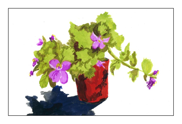 Altogether, I had a fun day painting. The best paintings are those done in sumi-e. I really like the palm trees and the frond, more so than the orchid, bamboo, or plum. The texture of the plum trunk was enjoyable to do, but the blossoms are too blotchy – you can see where the paint plopped down and spread. I must admit, too, that I find pictures I have done with Marie’s paints never satisfy me – the colors are too garish. I do know, though, that Teacher does lovely stuff with them, and when I work hard at it, I can produce paintings which appeal to me.
