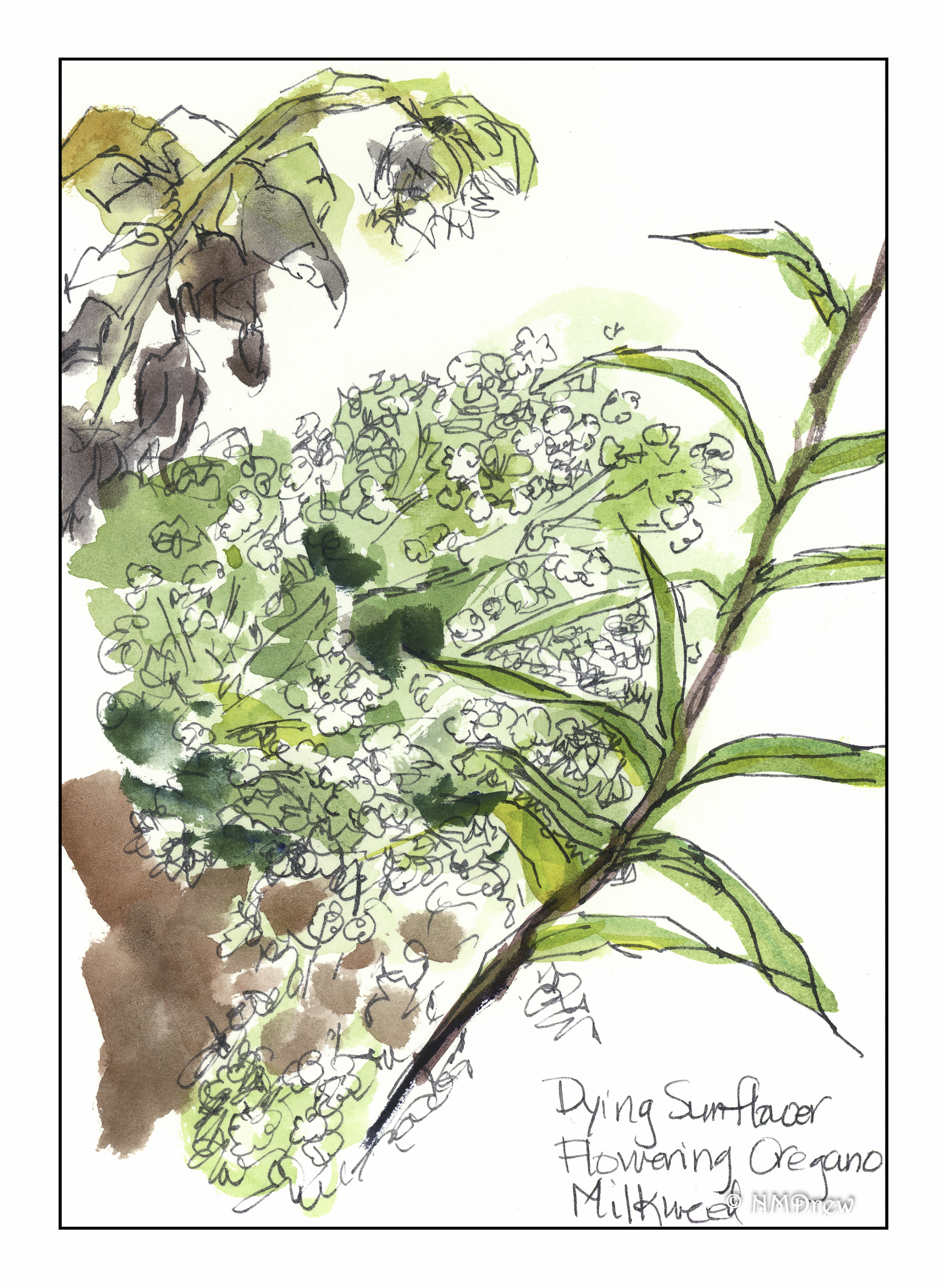 Let’s start with my painting of Greek oregano, growing like a weed in a pot on the patio. The leaves are simple enough, shaped somewhat like an egg (but flatter 🙂 ) on long, straggly stems. The color is sort of that dull, sagey-olive green that plants in the Mediterranean climate often have. In sunlight, a bit of warm yellow shows up. In shade, the greens are darker. Pretty logical, right?