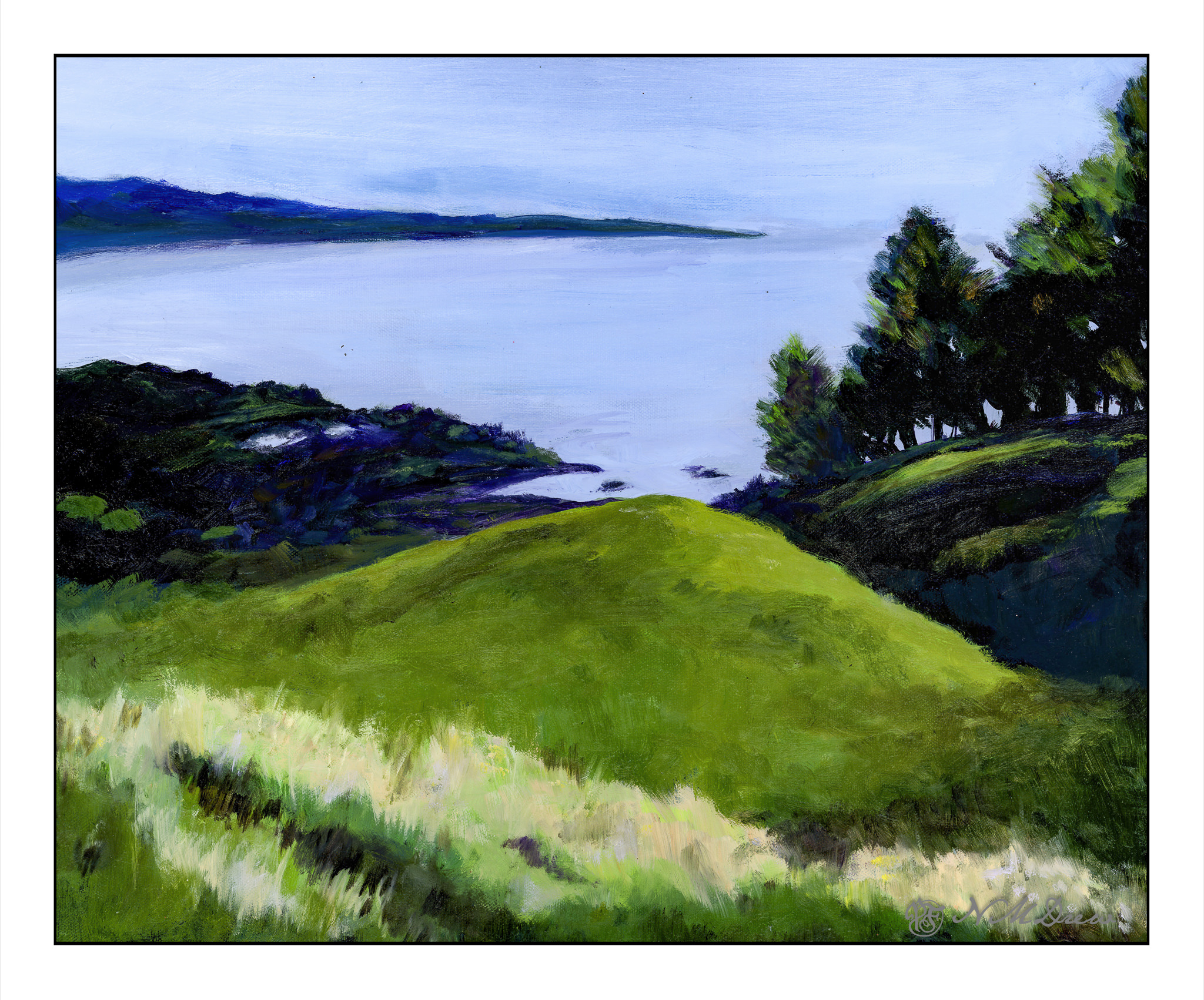 Awhile ago I went to Newport, Oregon, with a friend. We spent a few days there and went to the various touristy areas around town as well as visited the Yaquina Head Lighthouse. It was a rather overcast day, quite chilly for the middle of summer. The hills were green and filled with wildflowers, the sea air fresh. Coming from a dry SoCal, it was a bit of paradise! I took a lot of photos, and this painting is based upon one of them.