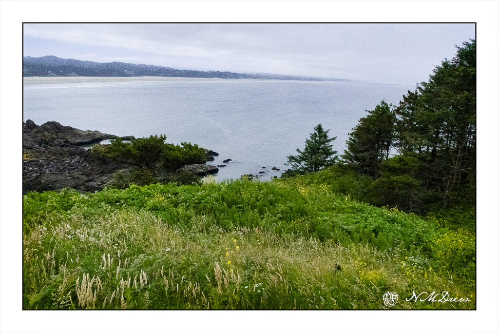 The day was overcast and rather cold and gloomy – I think maybe 60F at the most in the dead of summer! Wind, too. Despite that, it was a great place to be, in part because of the whole area is so different than Southern California, as it is very lush in summer, rather than our drying vegetation and overall beige coloring. Here, the view is from a pathway leading toward the lighthouse, looking across the cove to Newport. You can see the wide expanse of beach, which is very flat, leading to another headland where I think another lighthouse may be found.