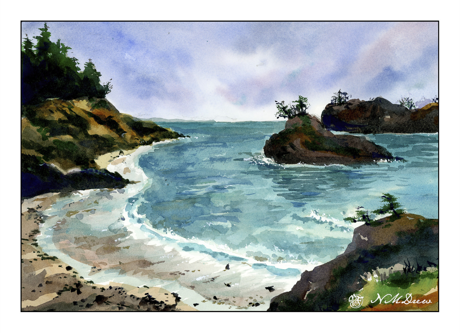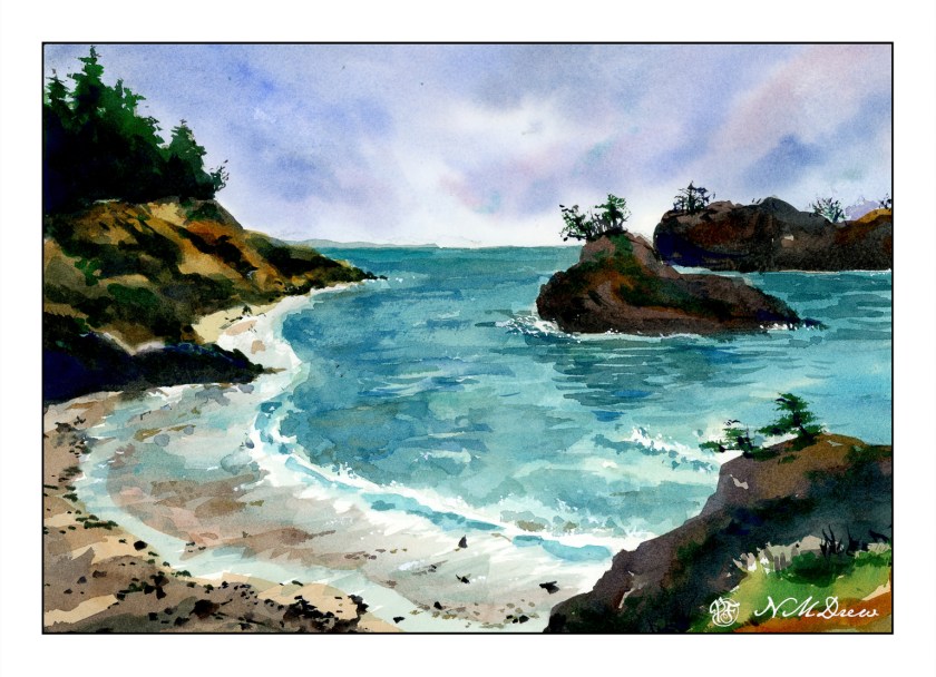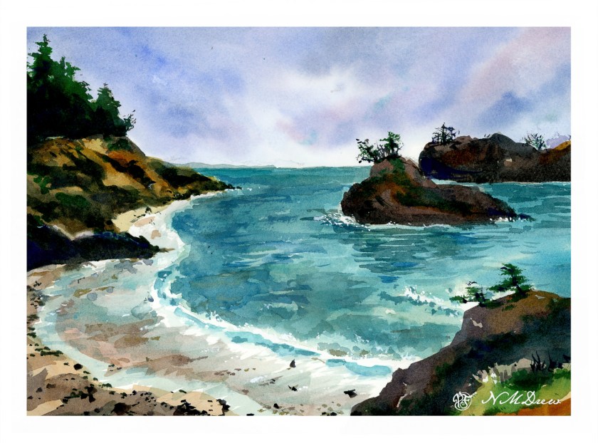 Awhile ago I went to Newport, Oregon, with a friend. We spent a few days there and went to the various touristy areas around town as well as visited the Yaquina Head Lighthouse. It was a rather overcast day, quite chilly for the middle of summer. The hills were green and filled with wildflowers, the sea air fresh. Coming from a dry SoCal, it was a bit of paradise! I took a lot of photos, and this painting is based upon one of them.