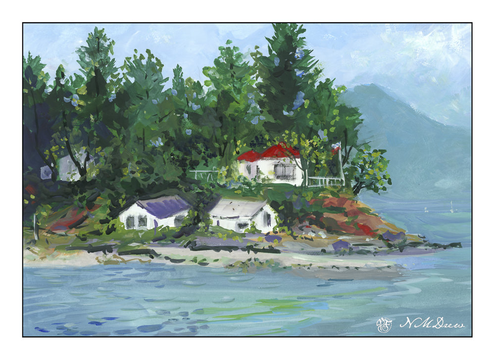 I finally found the image of “Coastal Light.” Comparing my version to hers, I found that what I really like with both are the way the tree trunks are delineated using light colors to show light without overdoing details. Foliage, too, was something which pleased me in both paintings, with Hanson’s being a bit more expressive than mine – I am a dabber, and my foliage is definitely dabbed! When it came to bigger areas of color, such as the distant mountain, foliage, and foreground, my dabs got all mushed together to create better color masses and shapes.