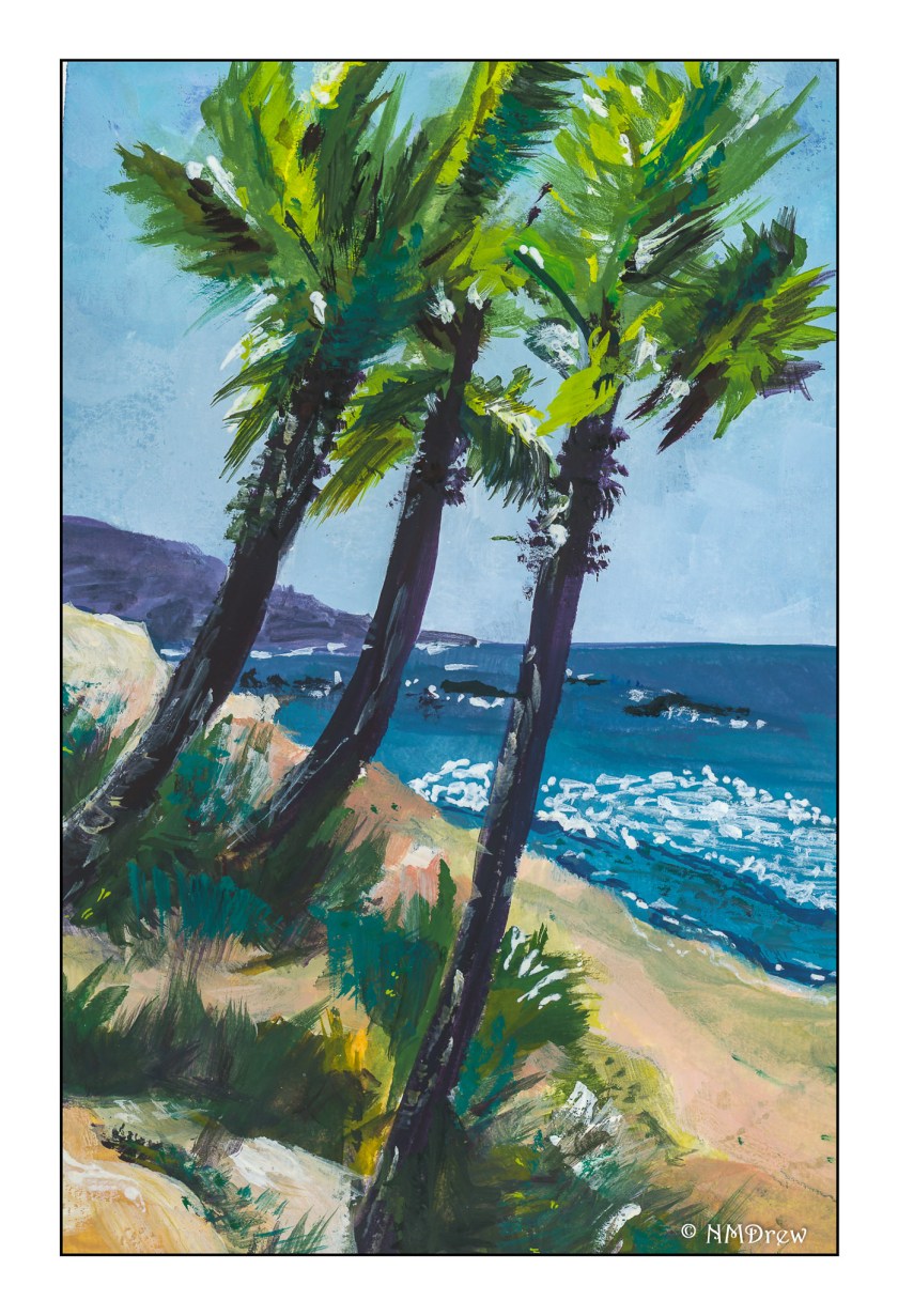 Gouache, palm trees, ocean, beach, coast. California!