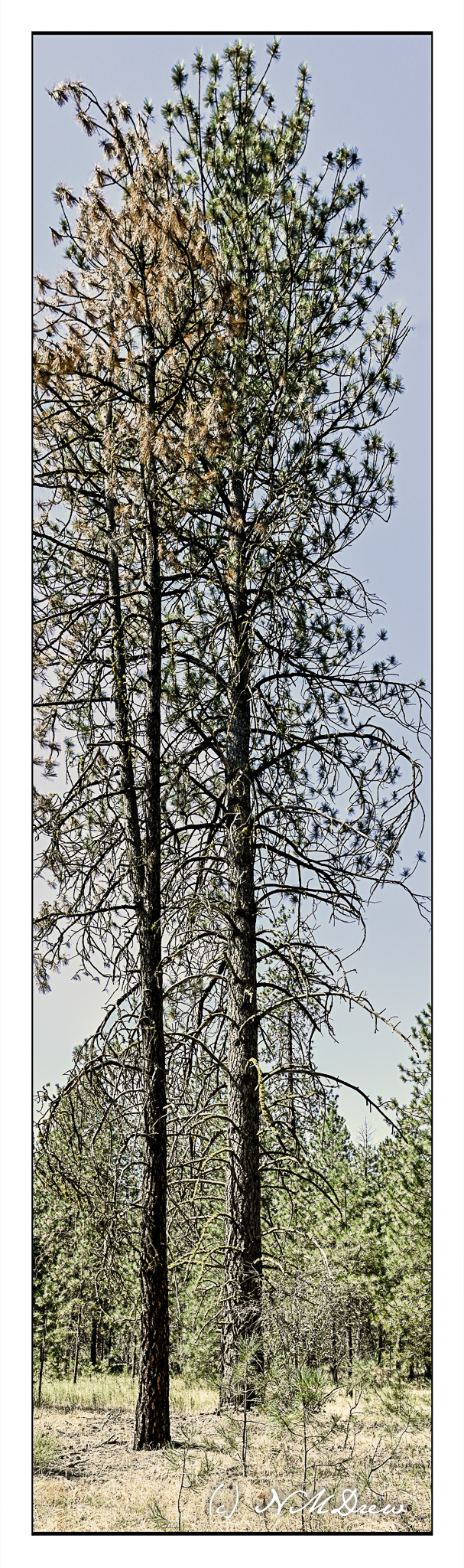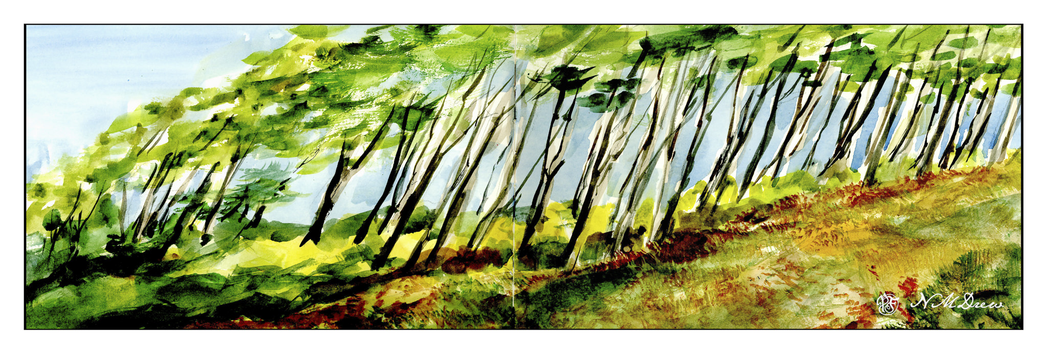 I did a quick sketch in pencil, just to get the general shapes of the trees and the land. I put in the tree trunks first as I wanted to be sure I knew their placement along the land. I used a mixture of blacks and greys, pale to dark, but initially light to indicate placement. From there, the foliage and the land. Once established, detail began, with dry brush strokes for vegetation and later for the leaves on the cypress. More than anything, I wanted a loose, windswept look with a sense of direction and sky.