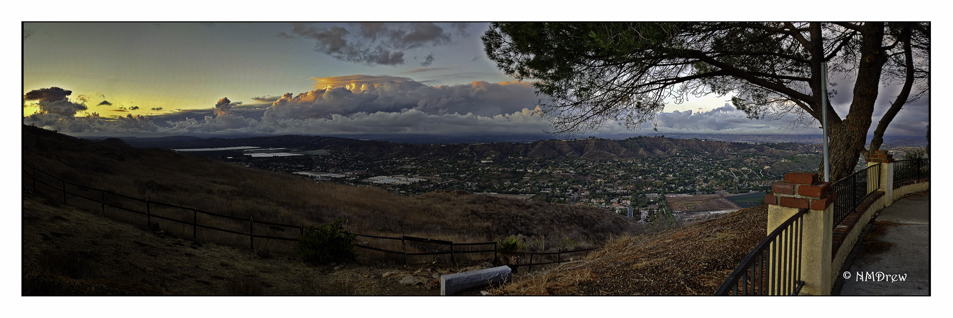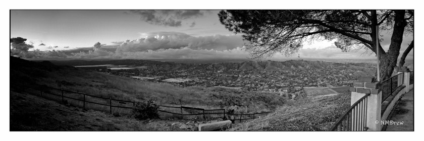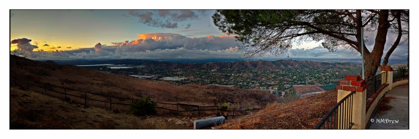 The rains cleared and the sky was filled with clouds! I went to my usual places but they were all closed – muddy trails, swollen creeks. So I headed for the hills, following roads I sort of knew might give me a clear view of the sky and city. This one was a total surprise. Suddenly I was wondering just what I was looking at, and then it hit me – I was looking into the valley beyond the mountains surrounding my own. The clouds were beautiful as the sun went down, so I took a series of pictures – 4 or 5 – and made a pano of them in PS. This made my day, let me tell you!