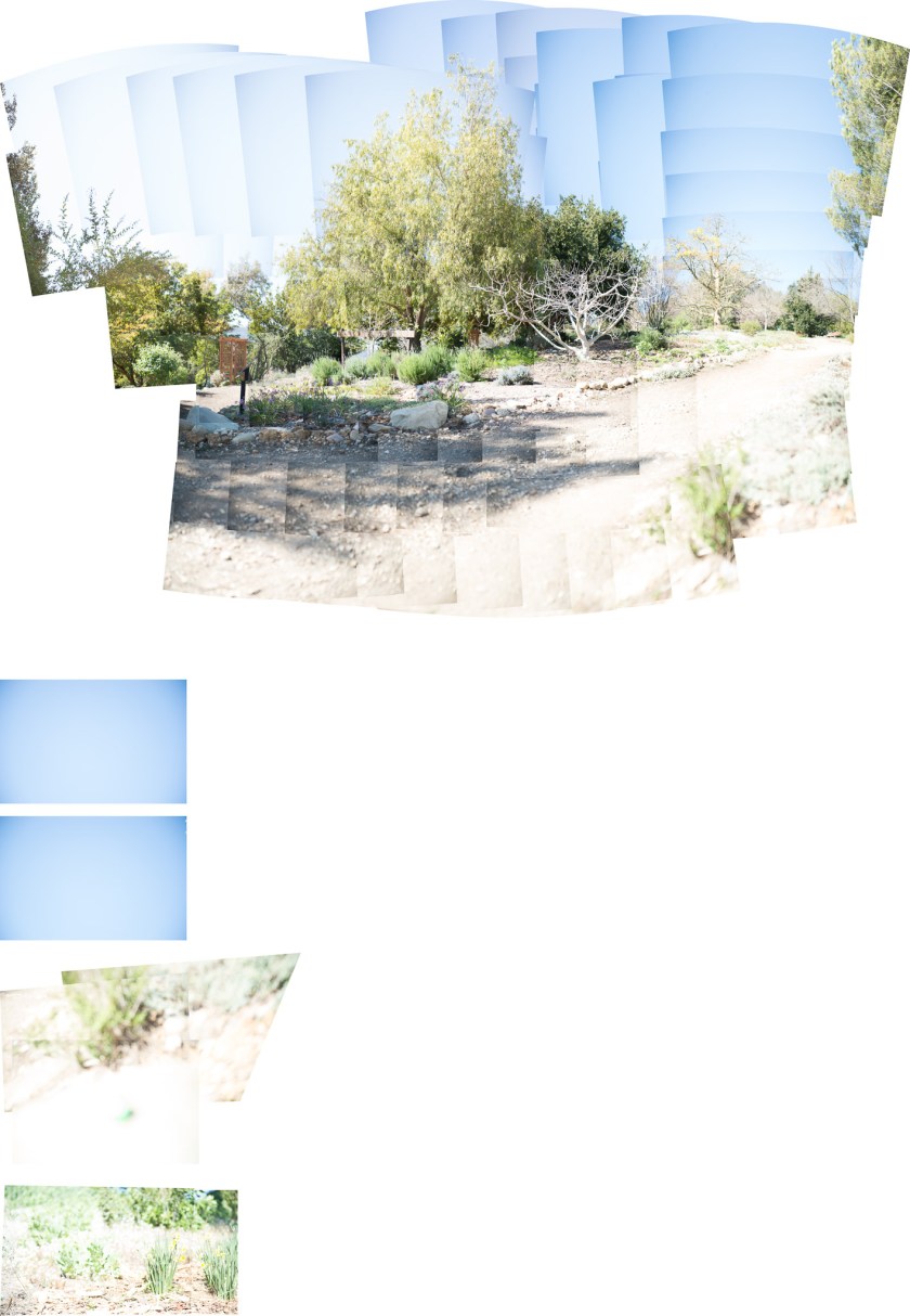 To get consistent image exposure, it’s necessary to use manual exposure and turn off auto focus. Consequently, I like to take an image using my preferred f/stop and do everything else on auto. Test images are important and worth the few minutes required to do. This will give me my shutter speed and iso. If the image is too light, I might drop the EV and so on. Once I like what I see, I set up the manual techniques, take a picture of my hand – often out of focus – and begin to take pictures. On a conservative day, I take maybe 20 images; on others I have taken as many as 130 or so. Fewer images taken works out better – easier on you (that camera gets heavy) – and easier on your software and computer when stitching the images together.