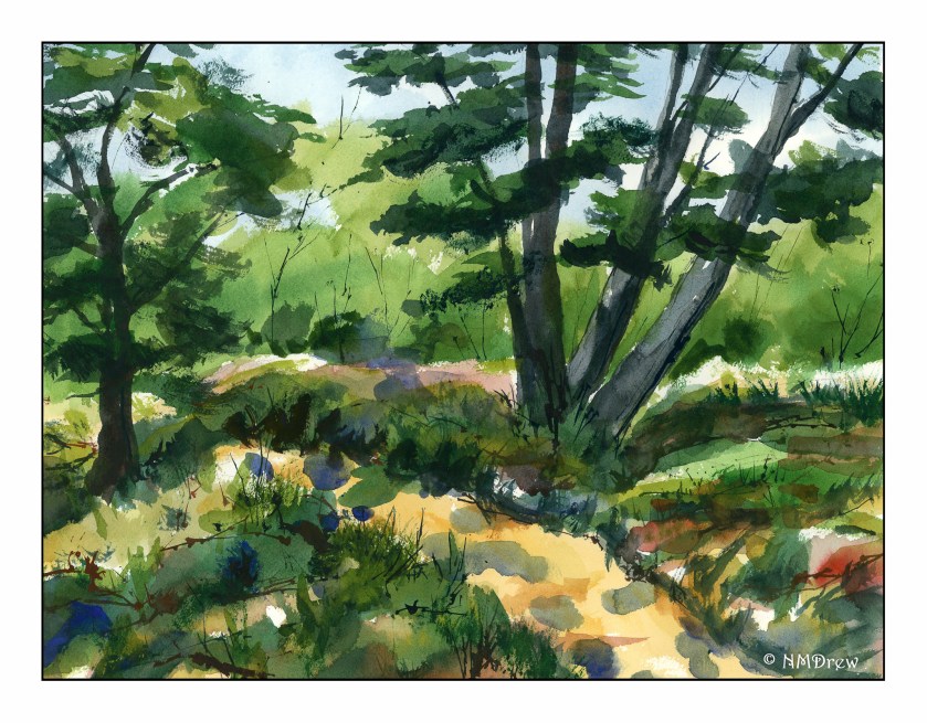 Above is one such example. Once more, my sense of depth is not the best. I tried to employ some of the techniques I know – atmospheric depth, less detail in the distance – but I really didn’t do a great job. In some ways, the painting sort of created itself. The path in the photo was curvier – way curvier – but it decided to become straighter as I painted. I just noticed that!