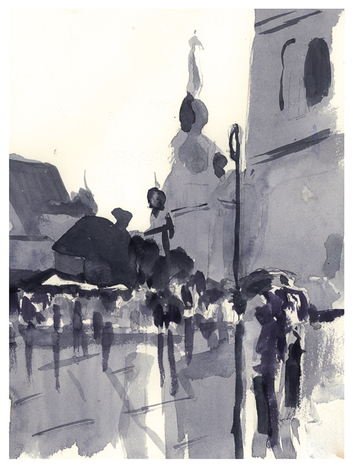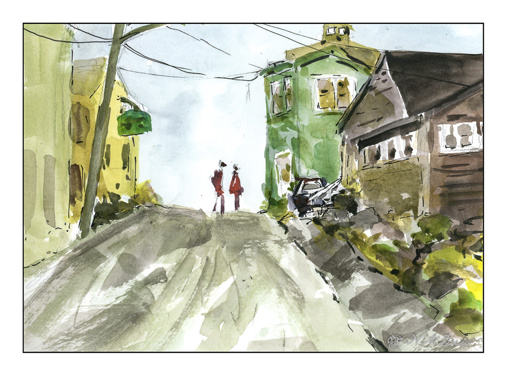 When I started inking the outlines, I began with the stop sign on the right. Can you see how stupidly out of proportion it is? You could knock an elephant out with it! The people and the rest of the drawing are in decent relationships to each other. Unfortunately, I used colors which are rather saturated and did not pay attention to the fact that the ink bleeds a lot. When I painted the major tree to the left of the building, the trunk should have been very light. The same with the mountains above the taqueria itself. Despite that, I like the way it turned out overall. A word of caution – don’t drive the cars as they look quite unsafe.