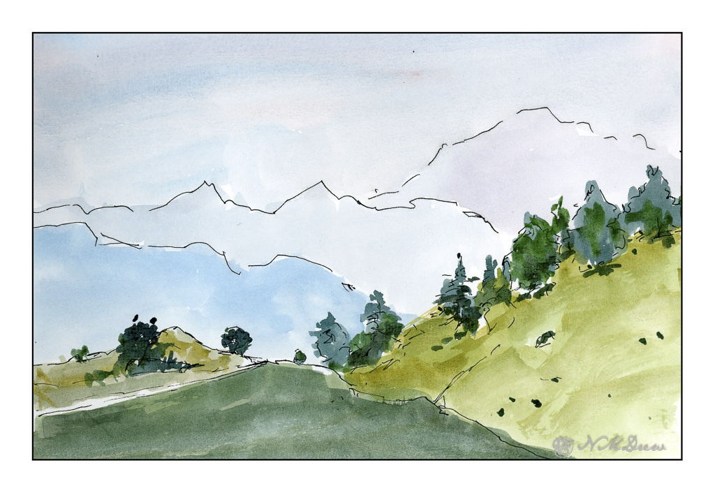 Ancient Copper ink; fountain pen; 140# CP watercolor paper; brush and watercolors. About 11×13.