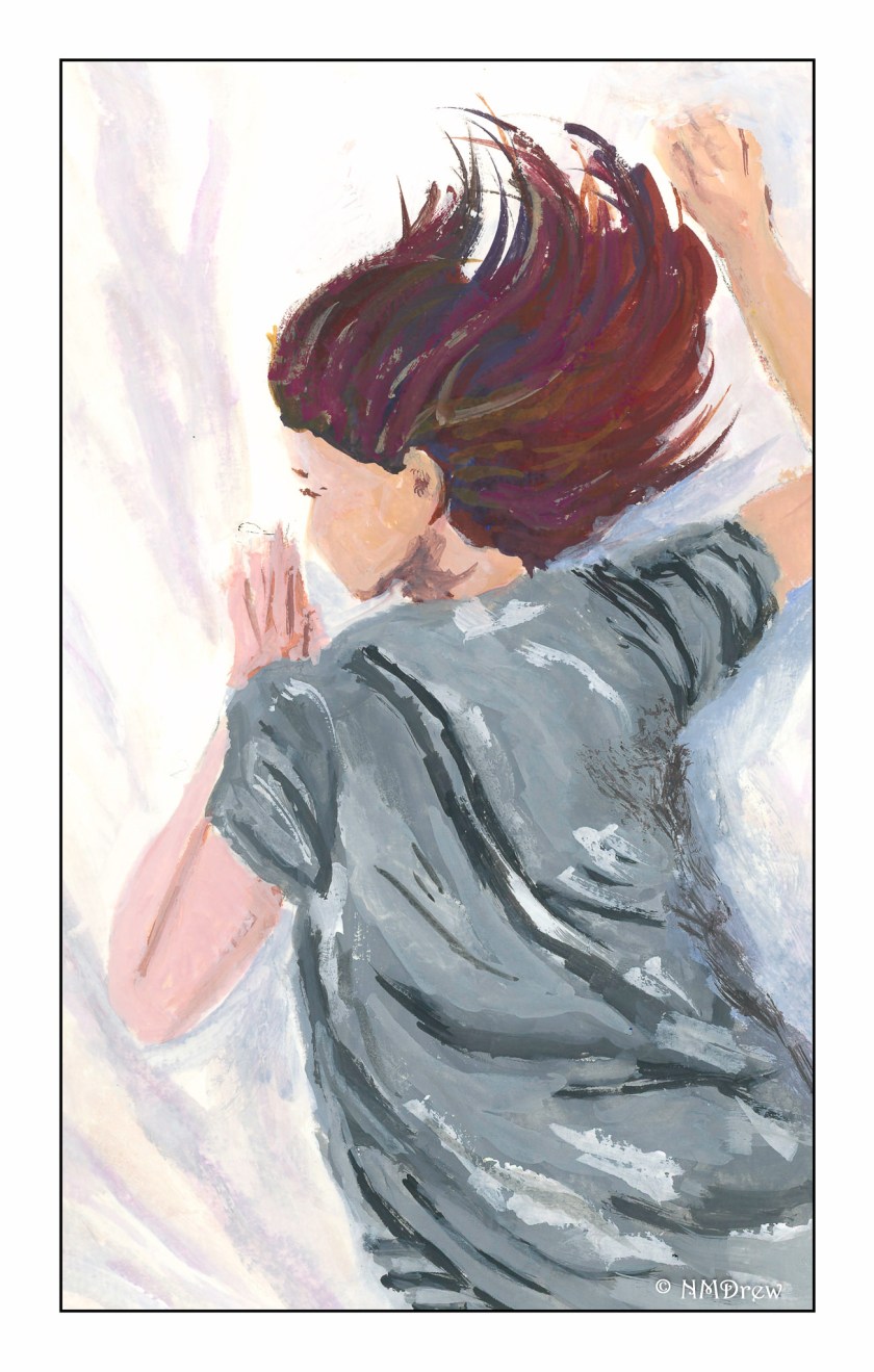 As with many of my paintings, this is from an image on Pixabay. A girl is lying face down on white sheets; she wears a grey T-shirt and her face is not visible. It would be easy to try to put in facial features and overwork a picture, and this is why I chose such an anonymous person.