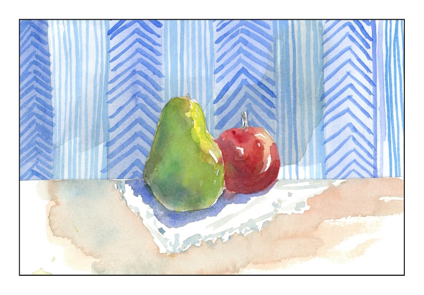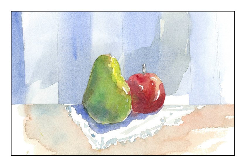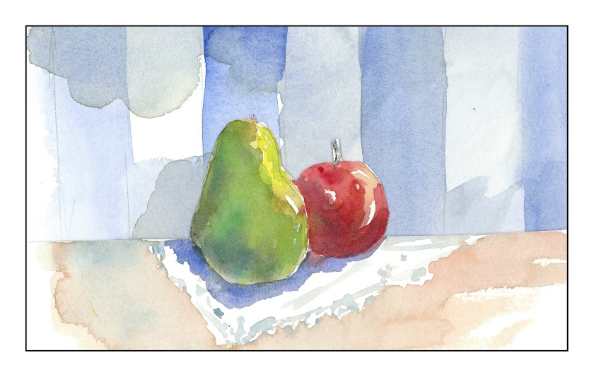 To emphasize his point about detail and edges, the exercise is to paint a still life apple and pear.  They should be fairly detailed – mine are not especially so, but do show highlight and shadow areas.  Then, this still life is cut out and set against different backgrounds.