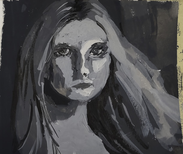 This is the final image. The paint is cracking a bit as it is really thick in some areas. Given this is 5×7 or less, the detail is not too bad, but I wouldn’t like to have this a portrait of myself! The goal of doing values is what is key here – light to dark, catching the face. Much room for improvement, but what I set out to do – a value study – worked out.