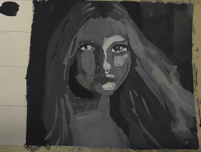 Once done, I chose gouache as the medium to use – already out on the desk, and easy enough to use without making myself crazy. First done was all the darkest values on my drawing.