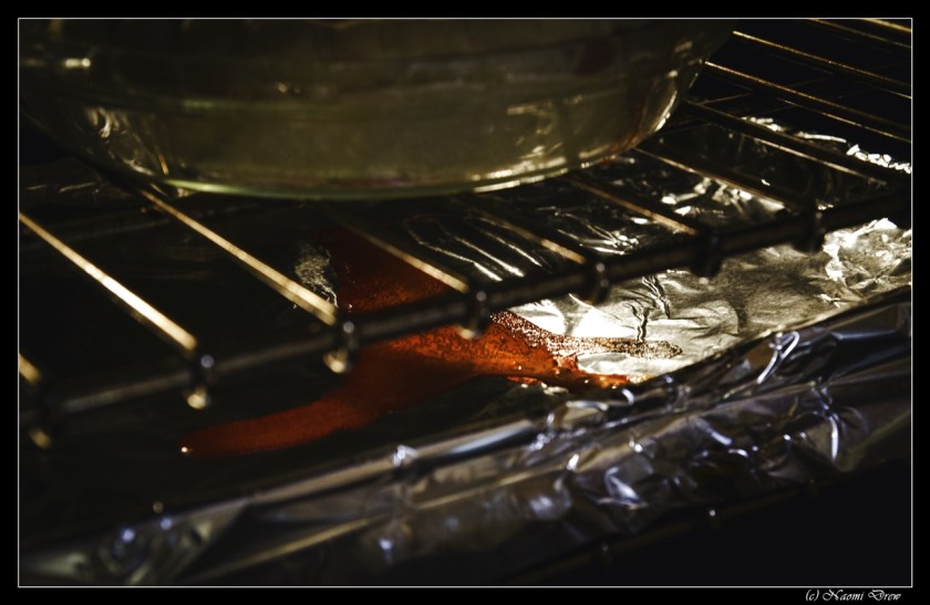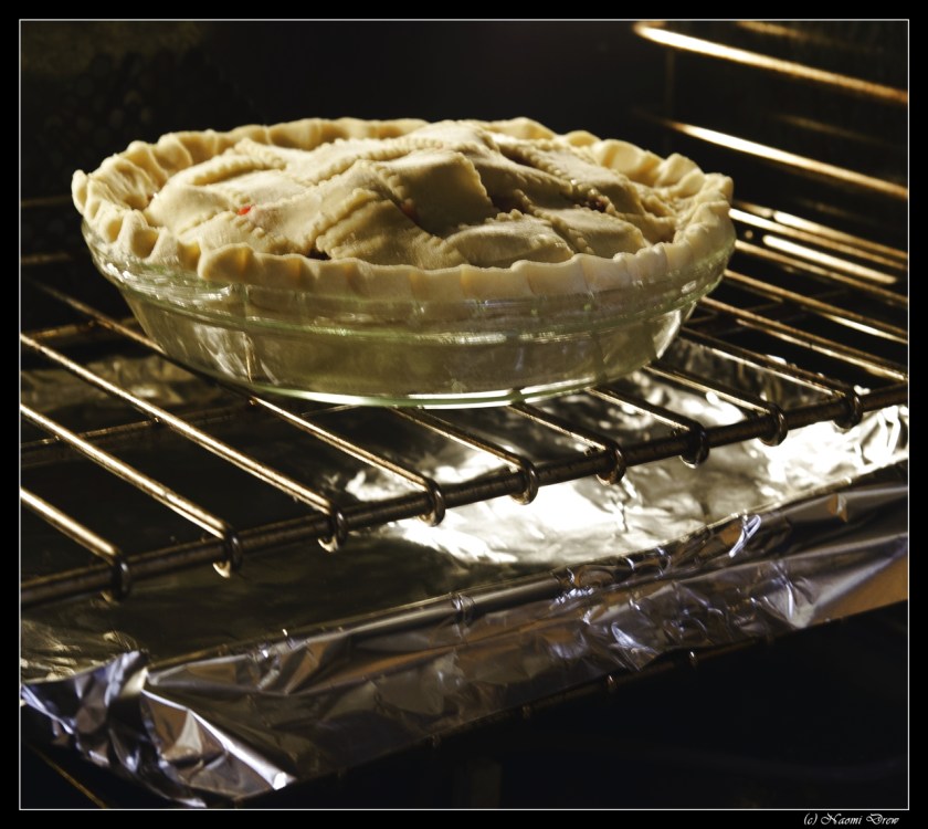 When you are ready to remove the pie from the oven, get another pair of hands. My husband carried the pie, and I followed underneath, with a wire rack crossing the foil-covered cookie sheet, to prevent goo from getting on the floor.