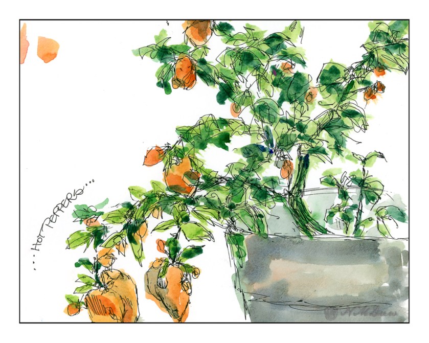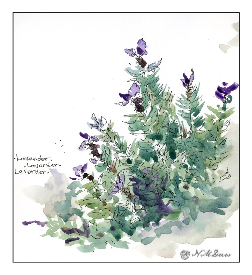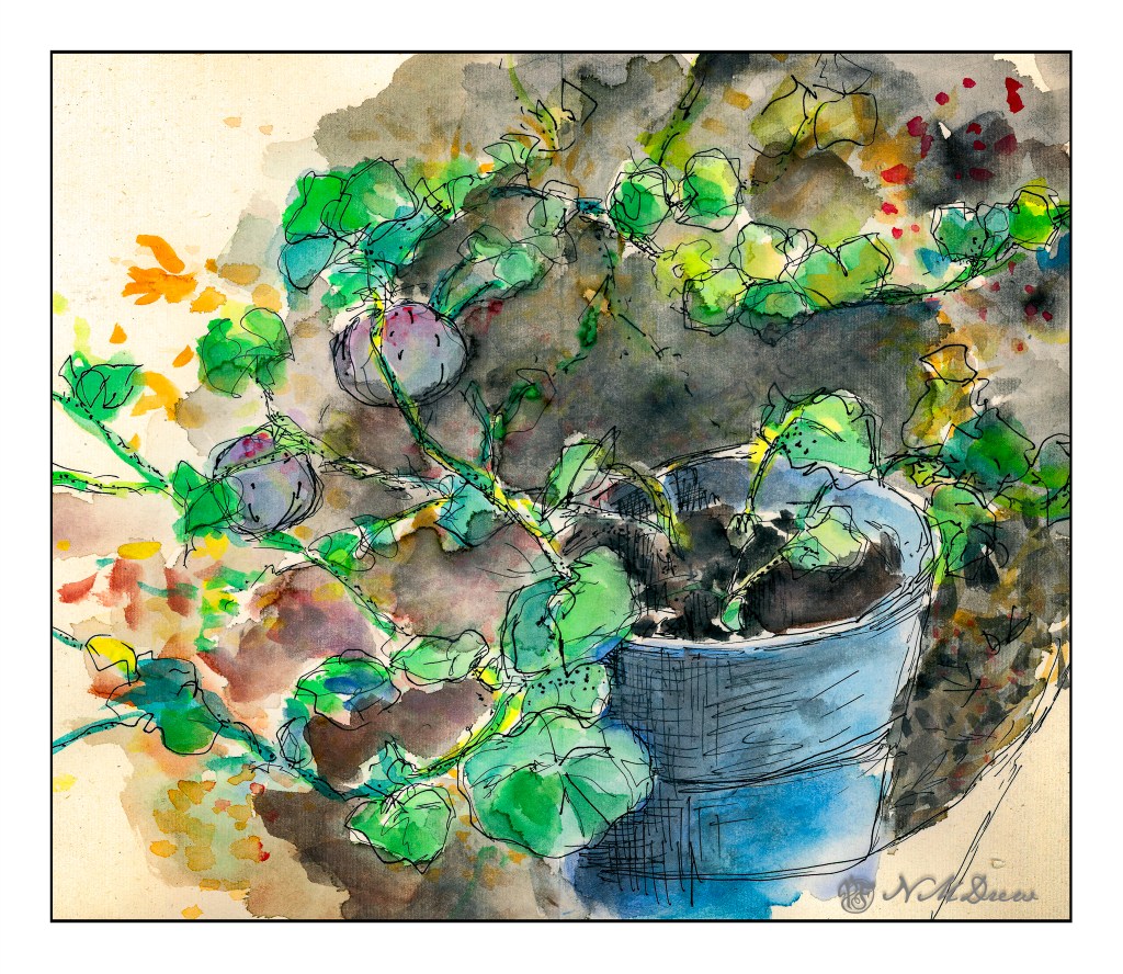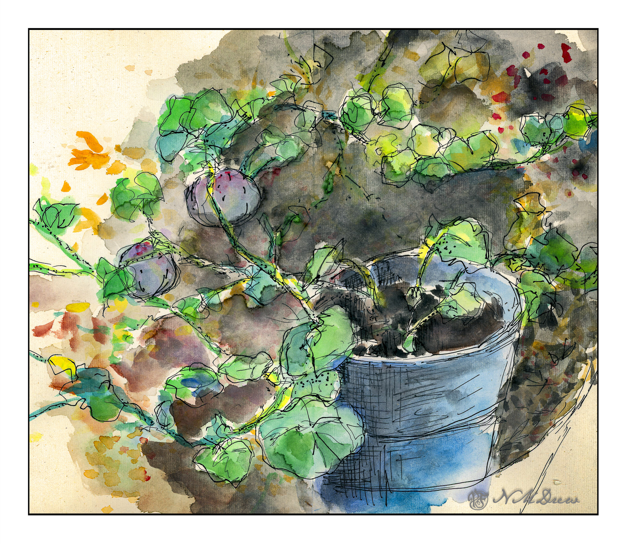For the past several days I have been working in watercolors on smooth paper to practice pale colors which would work well with ink. I think I am getting it. Easter Sunday, though, I was getting a bit bored with the colors I was using as well as the lack of papery tooth to hold colors. As a challenge, I decided to paint a building. I realized why I am intimidated by buildings – they have straight lines and a jerk of the brush can ruin a good, hard edge.