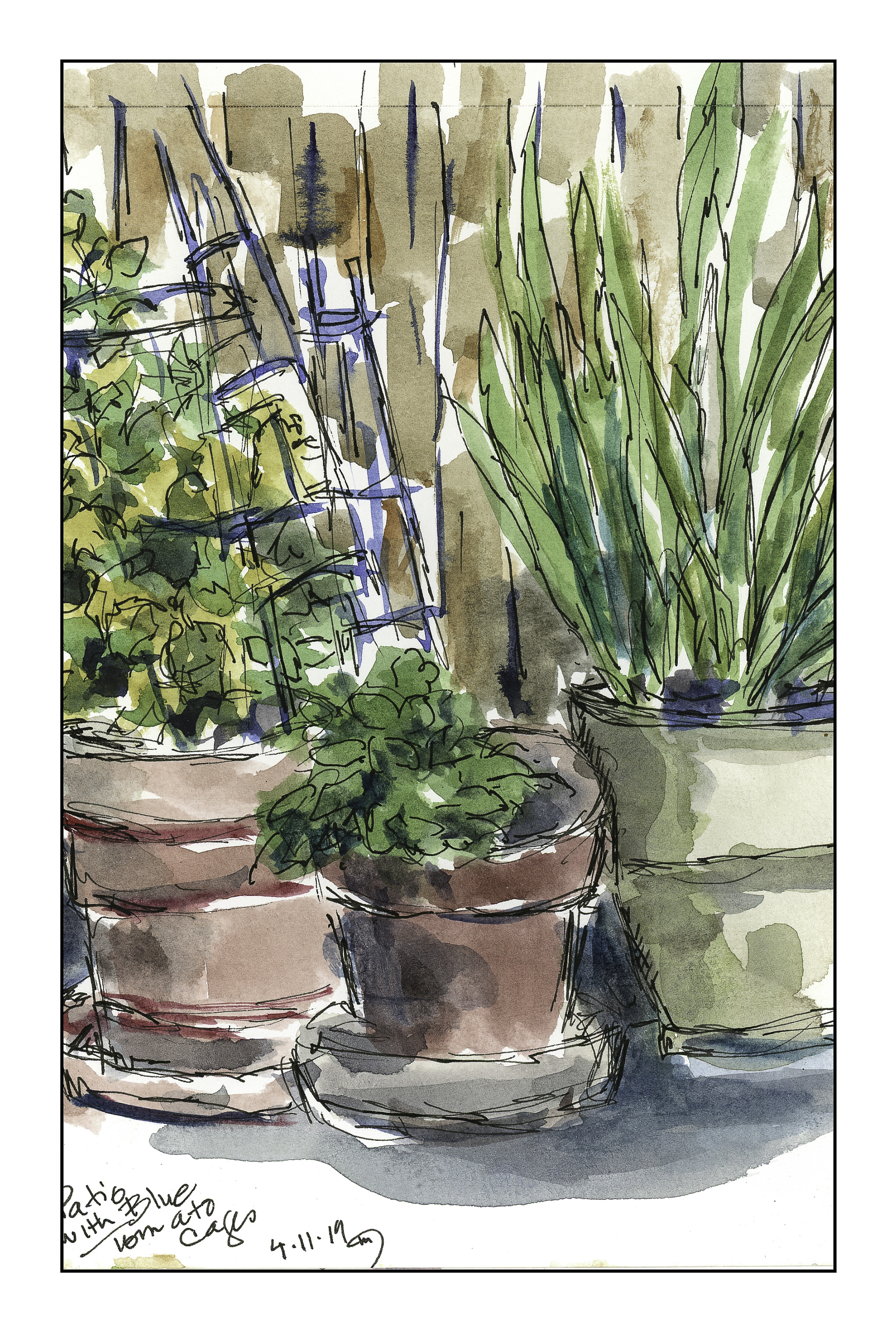 From here, I looked toward the fence facing the front of the house. Here we have a jasmine, bulbs, and mint. Behind them are the blue tomato cages, sometimes used to support tomatoes, and sometimes peppers or vines. Another ink and watercolor sketch; this time, 10 minutes allotted.