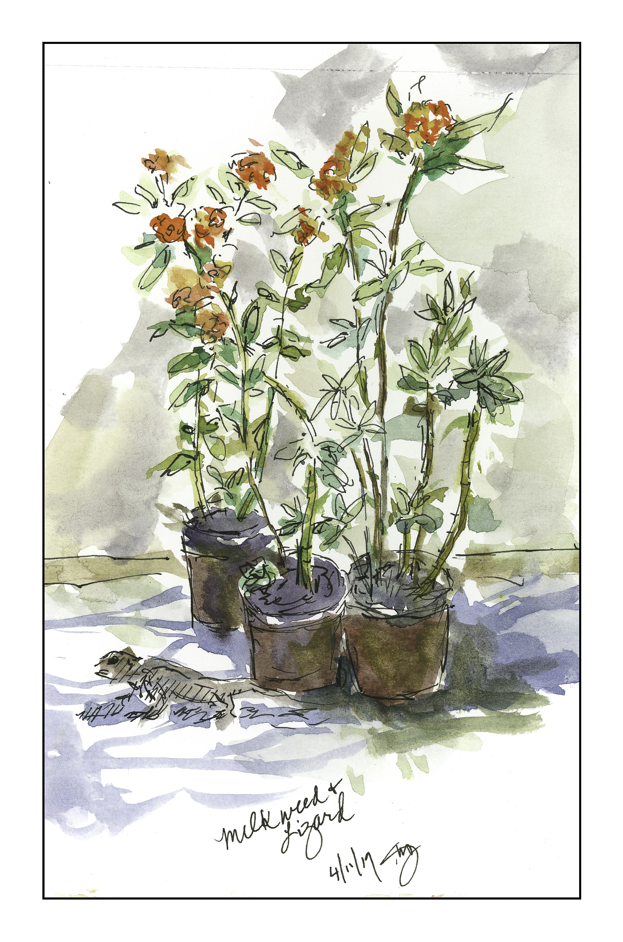 Now, back in town, everything is caught up and time to play! I moved out to the side patio where we have peppers, flowers, herbs, and sundry plants for our pleasure. We have a few resident lizards, too; they dart around and sometimes we find them in the house. When we do, they are gently moved outside. They are a lot of fun to watch as they do push-ups in the sun. And that is what we begin with below – a 5 minute ink and watercolor sketch of milkweed and a lizard that flitted in and out of the picture. Rather a stiff picture – amazing what you lose when you don’t paint or draw every day.