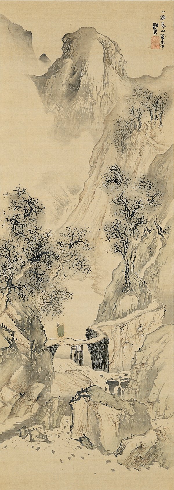 In Landscape with Solitary Traveler, we have a more Chinese approach to ink painting. The theme and constructs are familiar – mountains, water, a path, a bridge, a pedestrian. As in Western painting, Asian painting has its own history and symbolism. The beauty is that these familiar subjects become personal and unique in the hands of the artist. This painting is done in ink, with only a touch of color added to the traveler.