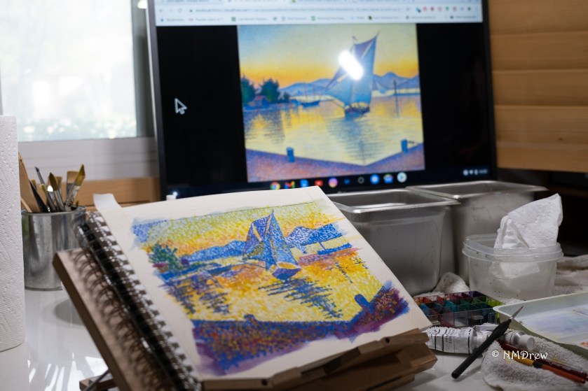 The takeaway here? More understanding on using color, and the strength of a good composition. Signac provided both, but copying brought home some lessons. It is hard to say what I am learning here, but I do know that my hardest lesson continues to be not making mud. Separating colors out from others – specifically, not blending them (too much) – is easily done in Pointillism. I wonder how this will impact my future work and practice.