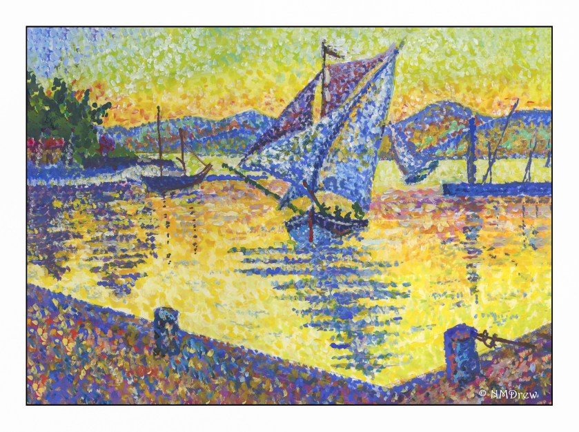 There are a number of things I like about this painting. The graduation of colors in the sky, from the blue in the upper left corner and its movement through the spectrum to green, yellow, and orange. The sailboats provide a visual dance, from the one in the center of the painting, and the especially delightful one further back on the right. That one, for some reason, just expresses joy to me. I used to sail a bit, and that one catches me in particular – the keeling over in a good wind is a grand experience! Finally, the reflections from the center sailboat along with the ones to either side, moving in to the dock. There is a sparkle and liveliness throughout the painting, and the usage of Pointillism really brings home that brilliance of the Mediterranean clime.