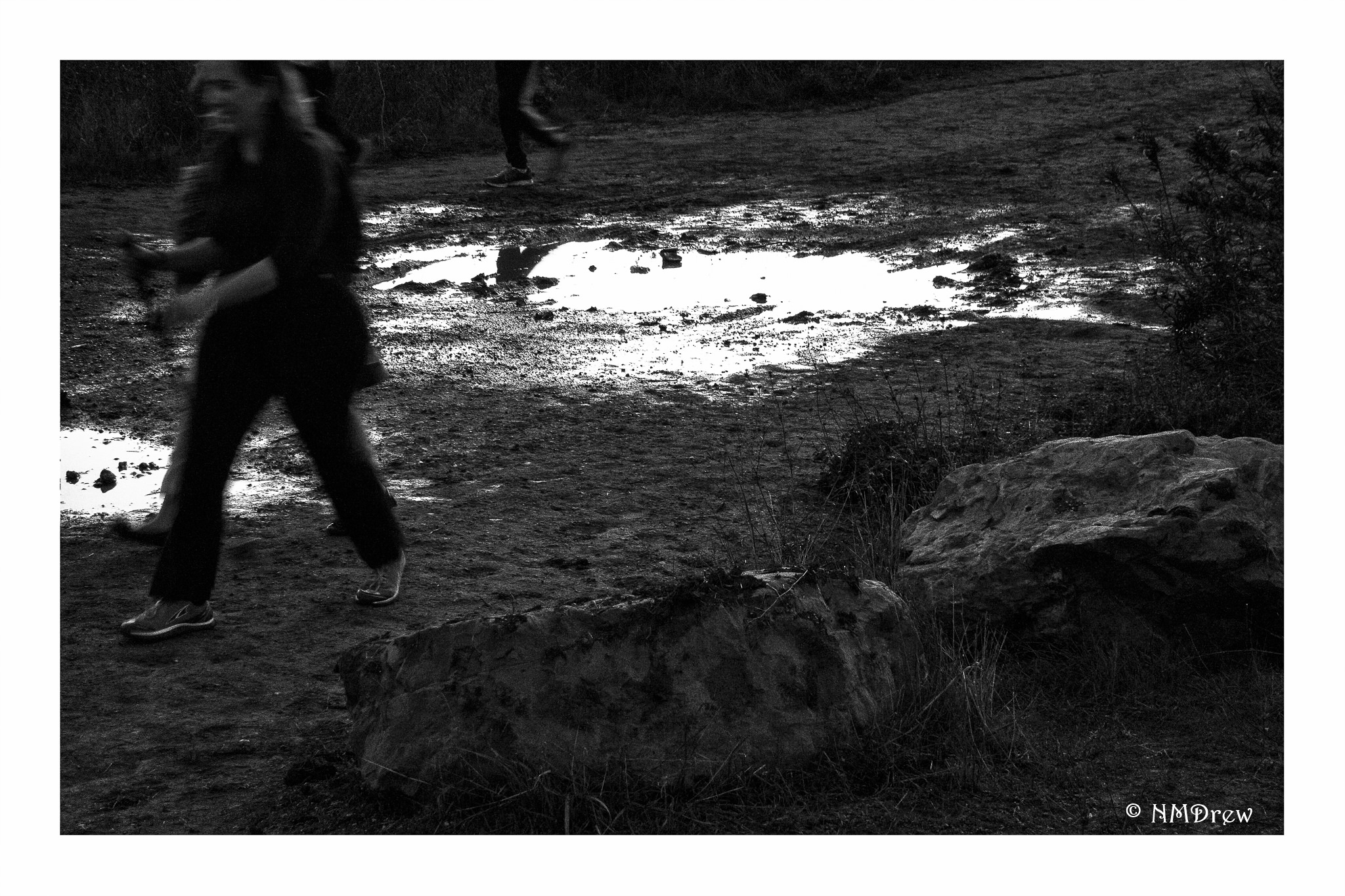 So, roads and tracks. Straight lines through a woods, a track over uneven back country here. Also, a suggestion of a water puddle or two reflecting a bit of the stormy sky above. Wet, green, verdant land. Sea or mountains in the distance. I want to walk that road.