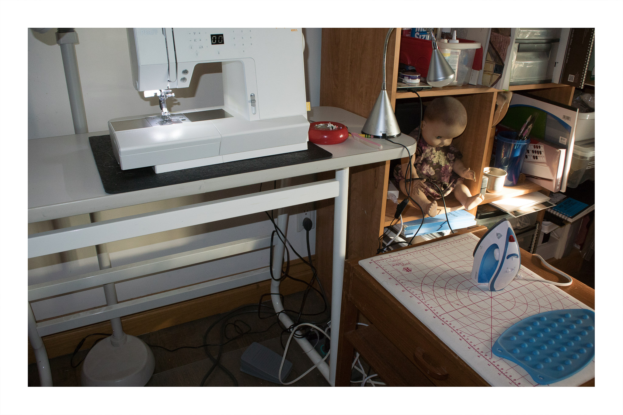 In the picture above, you can see that I have set up a small pressing station next to me. This keeps me from getting up and down with each seam. Many people do this. The little iron is really nice – and really inexpensive, too! It’s a “Hot to Trot” mini iron by Sunbeam, with a mini price of $12.99 at Target or on Amazon. It heats up quickly, has steam, has steam bursts, and is comfortable in the hand. The ironing pad is also a cutting board on the other side, but I find it easier to walk over to the drafting table if I need to cut anything (first picture).