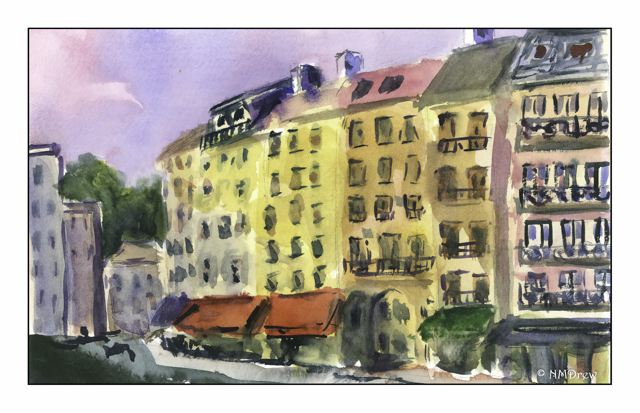 Here, some old buildings in Paris at sunset. I am rather pleased about this watercolor for a few reasons. Perspective works, with decreasing detail, lines, and atmosphere. The sky is pretty killer, too!