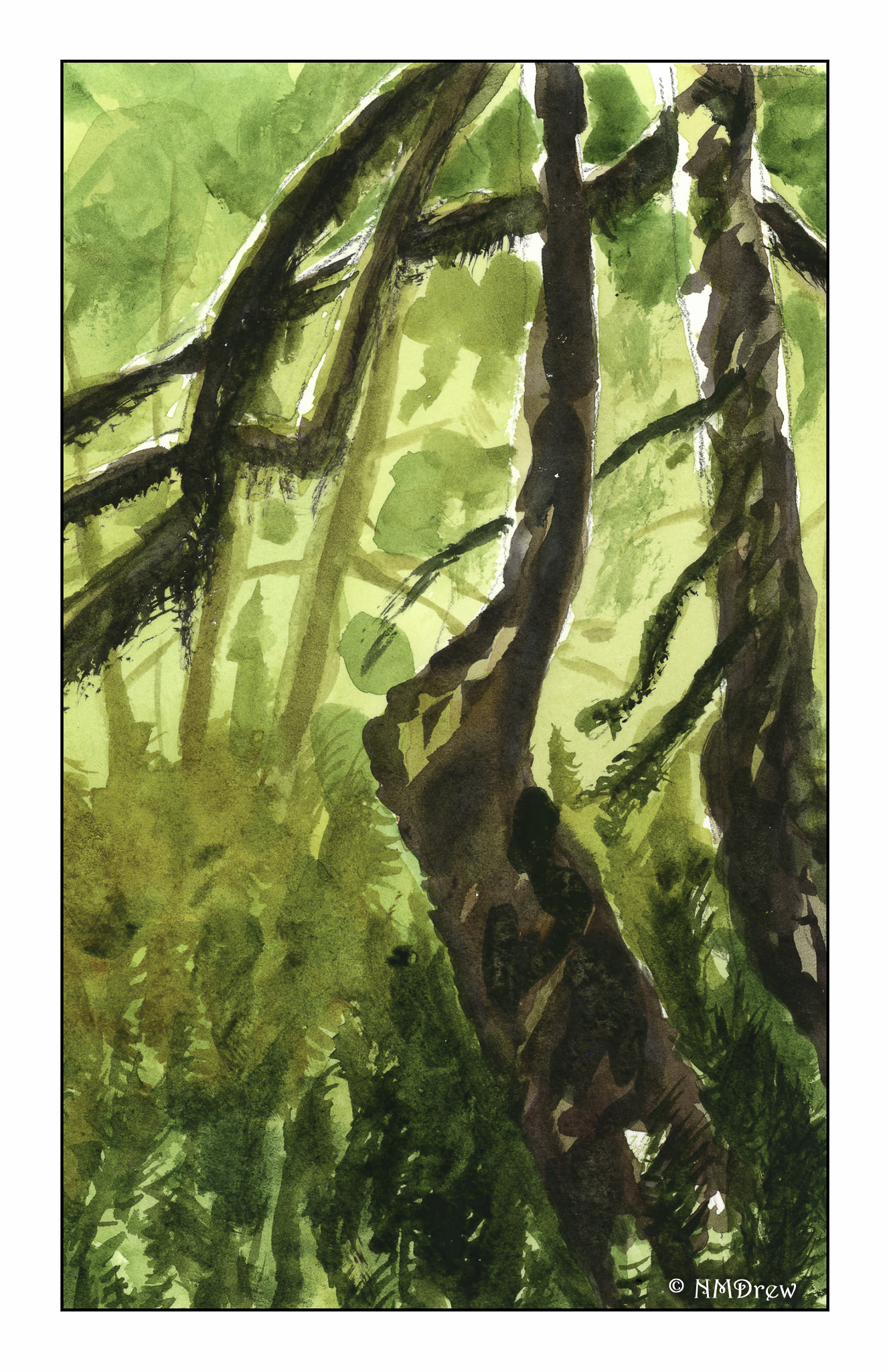 Here, from some photos and memories of our trip to the Hoh Rain Forest in Washington State. Paths wander beneath ancient cedar trees covered with moss, a green canopy, and little if any sky visible.