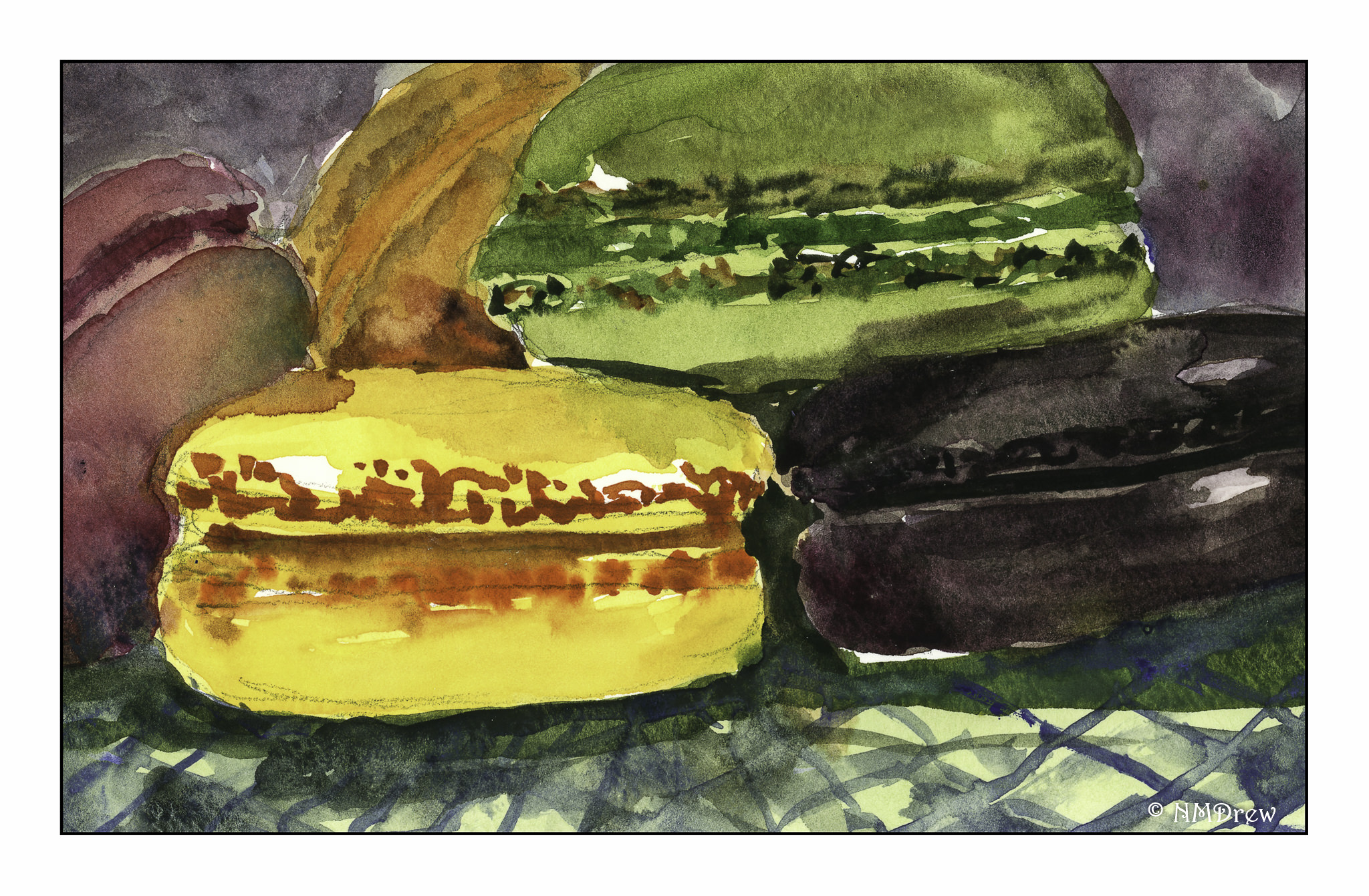 Cookies! I really love cookies (but like pie better, I admit), and for elegance and color and delightful flavor, macarons! Here, lemon, mocha, pistachio, orange, and raspberry.
