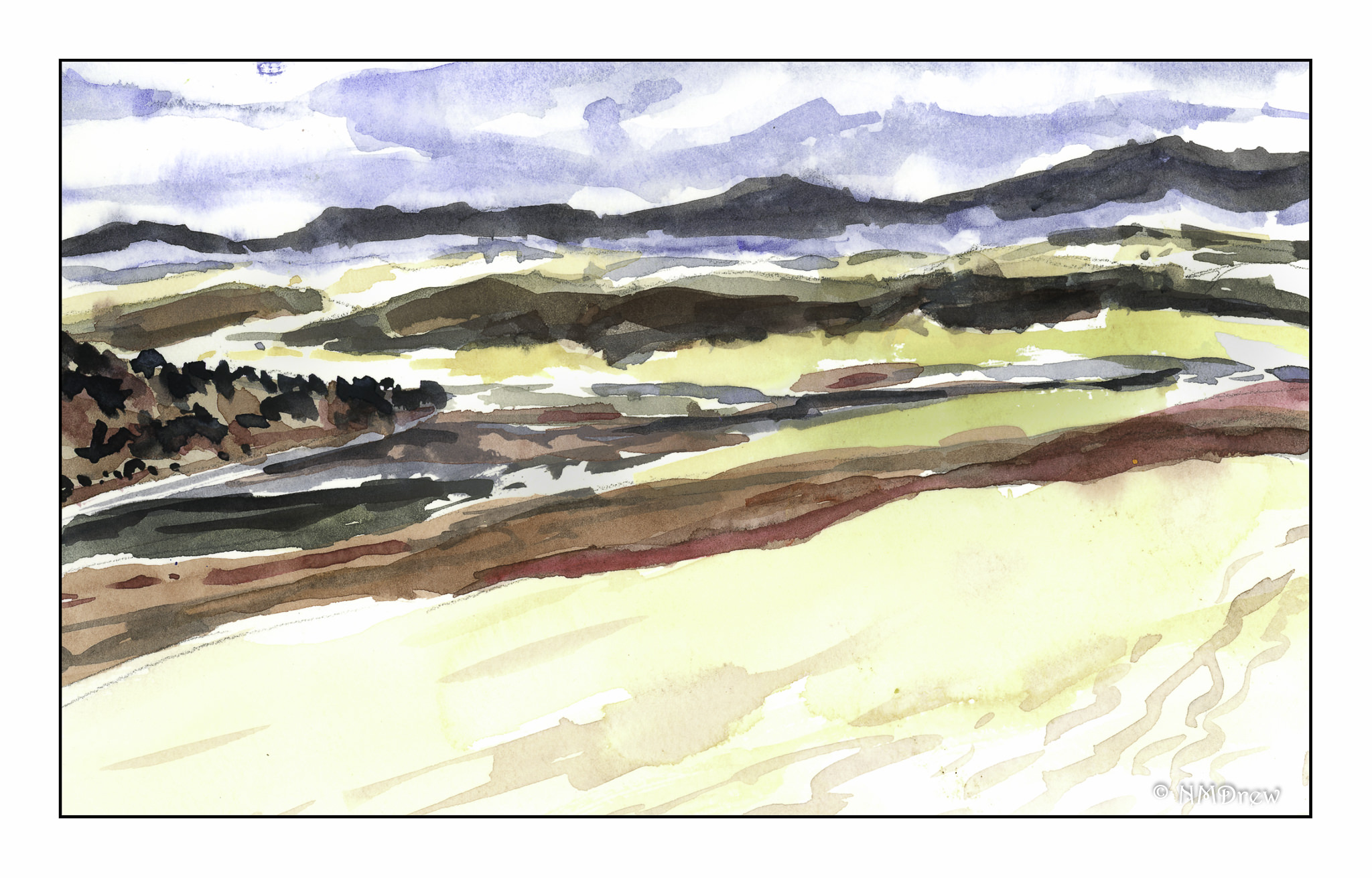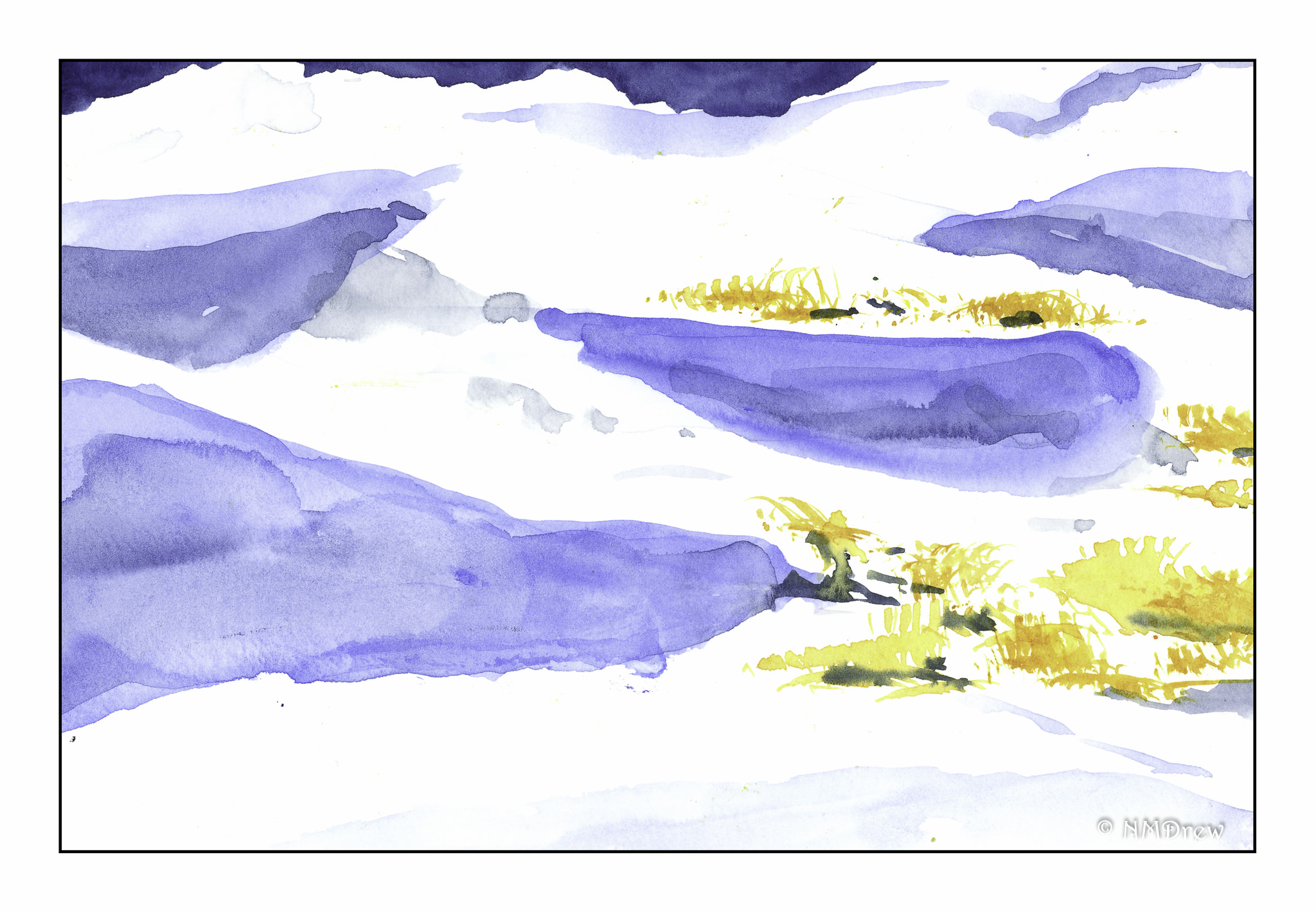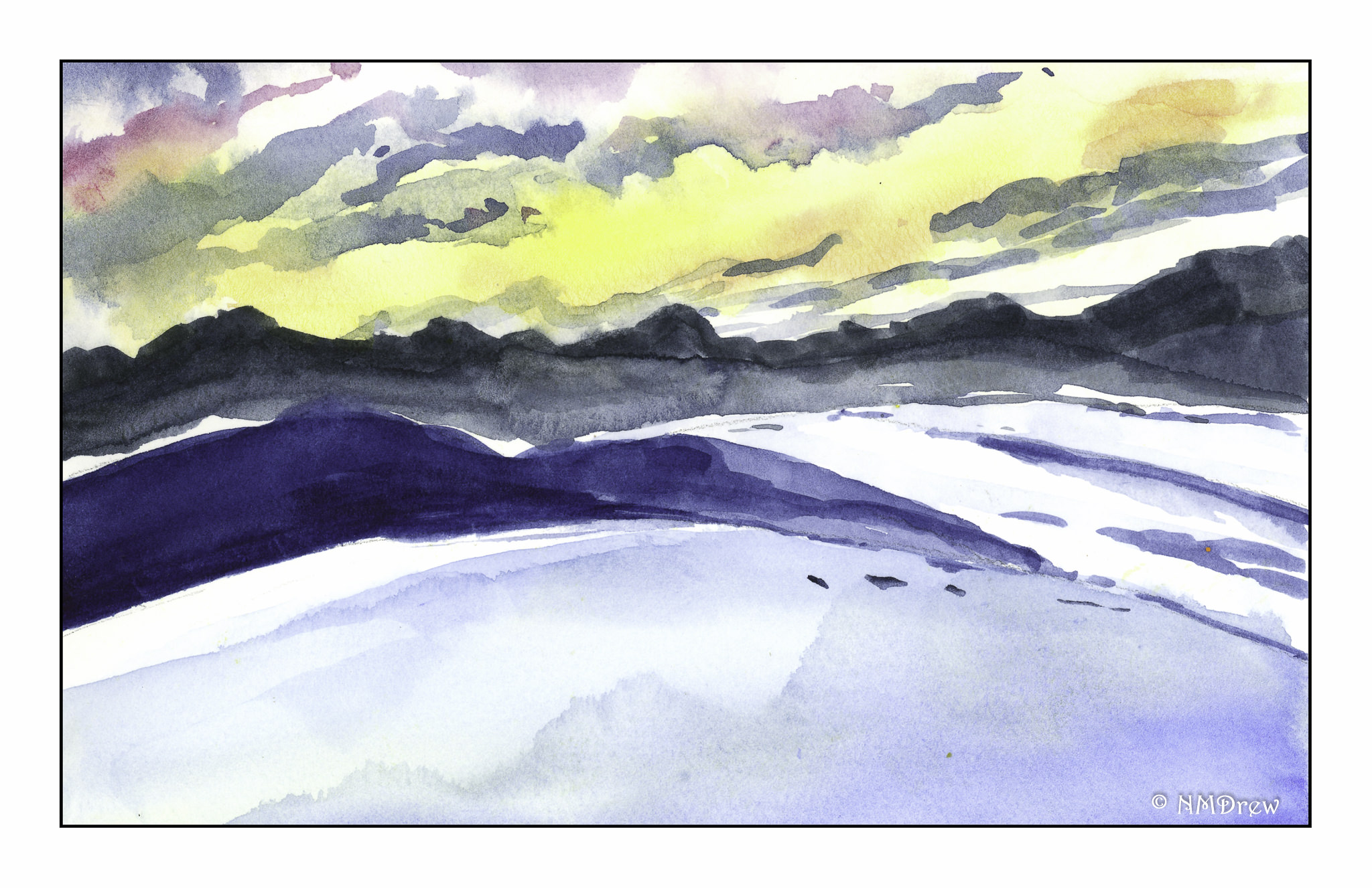 The White Sands National Monument in New Mexico is an amazing place – white sand dunes in the middle of a desert, scant plant life, dramatic skies and mountains all around. It was also incredibly difficult to paint the whiteness of the sand . . . nothing particular awesome about my paintings.