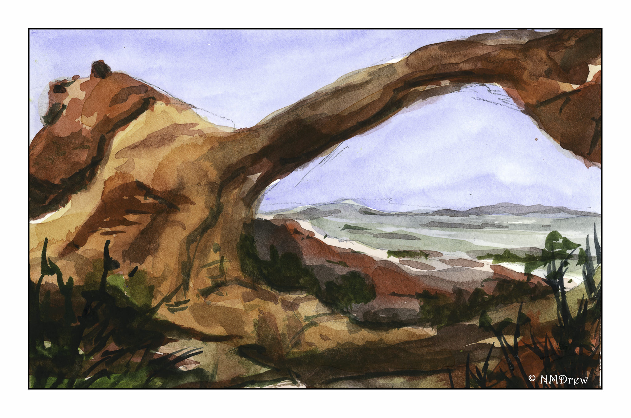 On the other hand, the Arches National Monument has some amazing things to offer – arches being one. The sandstone, eroded by wind and rain, has left some amazing geological remnants behind. This watercolor really pleased me . . . again, perspective and distance issues, as well as my usual problems with conveying depth. To do so, I simplified the background hills with a few lines of color. I put more detail into the middle ground, which was the arch and the red sandstone behind the arch, and in front of it. Plants on the lower corners and border became the foreground. To aid more in the depth, I did a light blue-grey glaze over the mountains, and applied a warmer glaze a couple of times in different areas of the arch and sandstone.