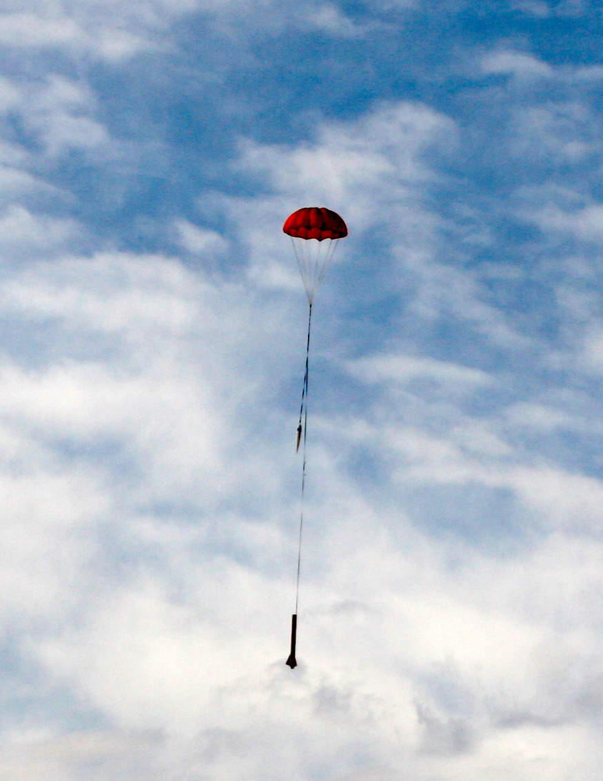 The motor I had chosen was an H-238, and the simulation software estimated it would boost my rocket to about 980 feet. The delay packaged with the engine was rated for ten seconds, so we cut a little hole in it with a drill bit to shorten that a bit. The launch looked good, although the rocket seemed to wiggle a bit just after it cleared the launch rod – perhaps because a crosswind caught it. While I have seen lots of rockets go completely out of sight, the comparatively high weight and low power kept mine in sight the whole time. It had a smooth climb to apogee, then turned and started down again. I had a terrible moment or two when the rocket was clearly pointing toward the ground and falling, but the ejection charge finally did go off. The chute deployed, and the rocket came down smoothly after that. It touched down only a few hundred yards from the pad, and when I caught up to it, I could see by grooves in the sand that it had been dragged about eight feet by the wind. There was no damage, though, and the rocket is ready to fly again.