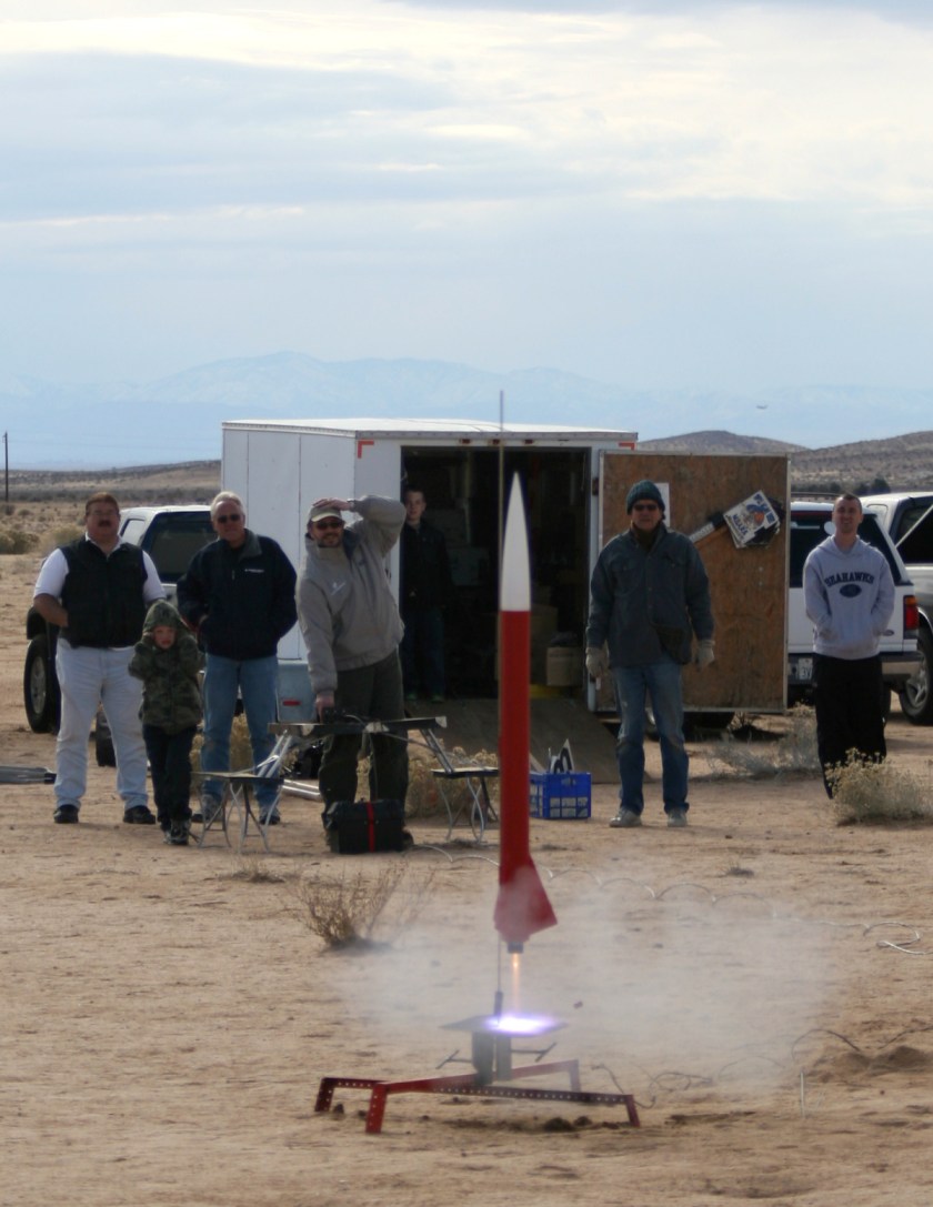 In between work and other obligations, it took several build sessions over the course of six months or so to get the whole thing ready to fly, but finally I was both ready and available on the club’s regularly scheduled launch day. My uncle and I went out to the club’s launch site in the desert, and we saw several flights despite the conditions, which were on the windy side. One rocket, launched to about 2000 feet, drifted more than a mile on its parachute before touching down again. I was a little nervous, but I knew that my comparatively large, heavy rocket would not be flying as high, especially given that I was planning to fly on a comparatively small motor, so I decided to go for it.