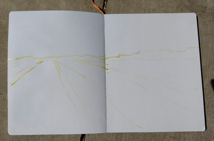 The first step was to choose the paper. In the end, I chose a Handbook across two pages. I had read somewhere about using a light color to create the outlines one might make with a pencil, so I used Quinacridone Gold and laid down the foundational lines.