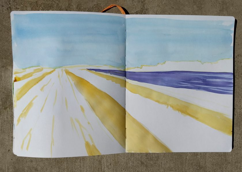 As each step of proceeded – from initial lines of the sketch to the flower field – I thought about brush strokes. The lines of the initial sketch were simple lines with the tip of the brush. The washes for the sky used the side of the brush. The fields of gold and violet were done as washes and as brush tip lines. The pink flowers were a combination of lines and curves and dots.