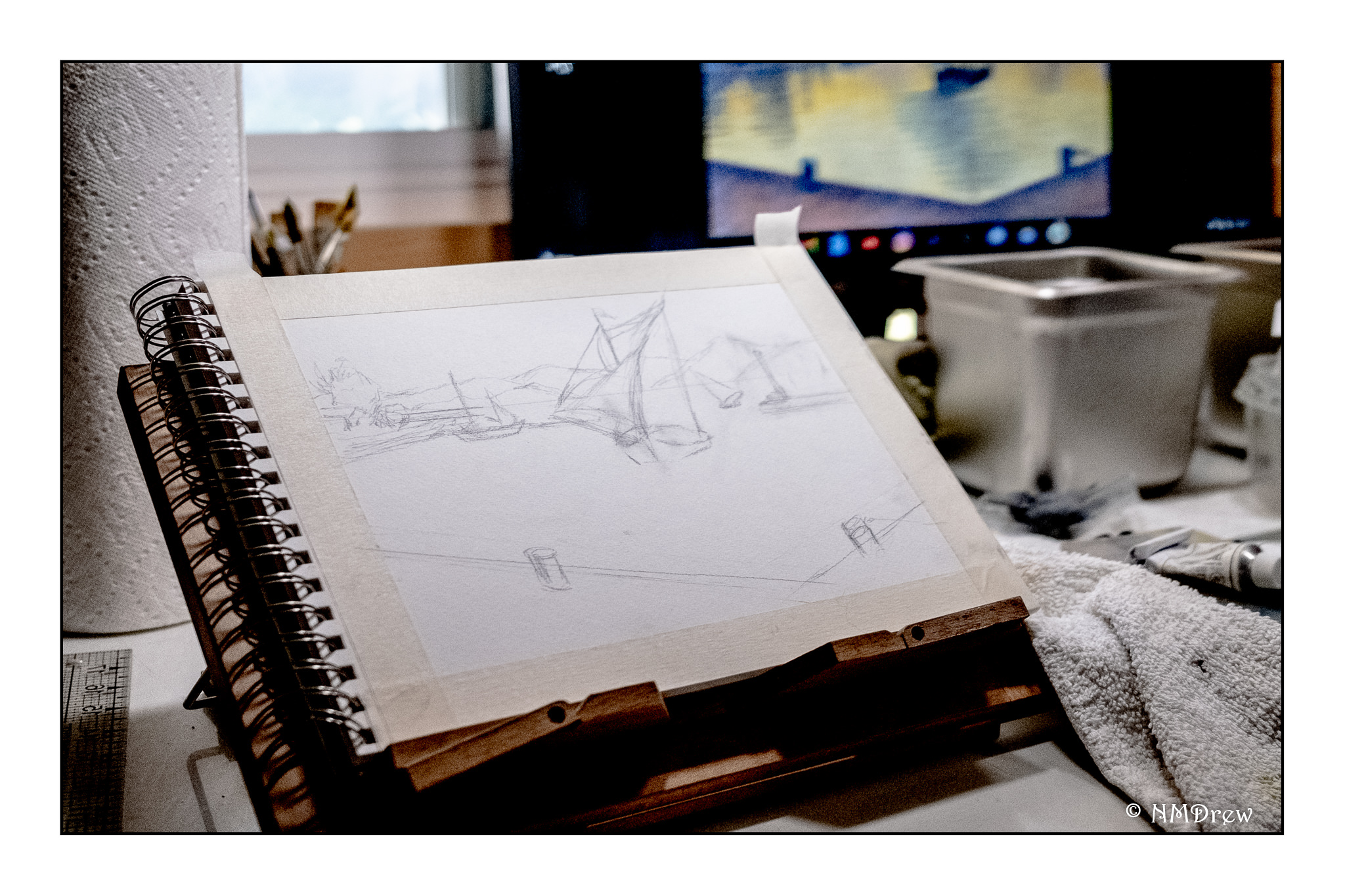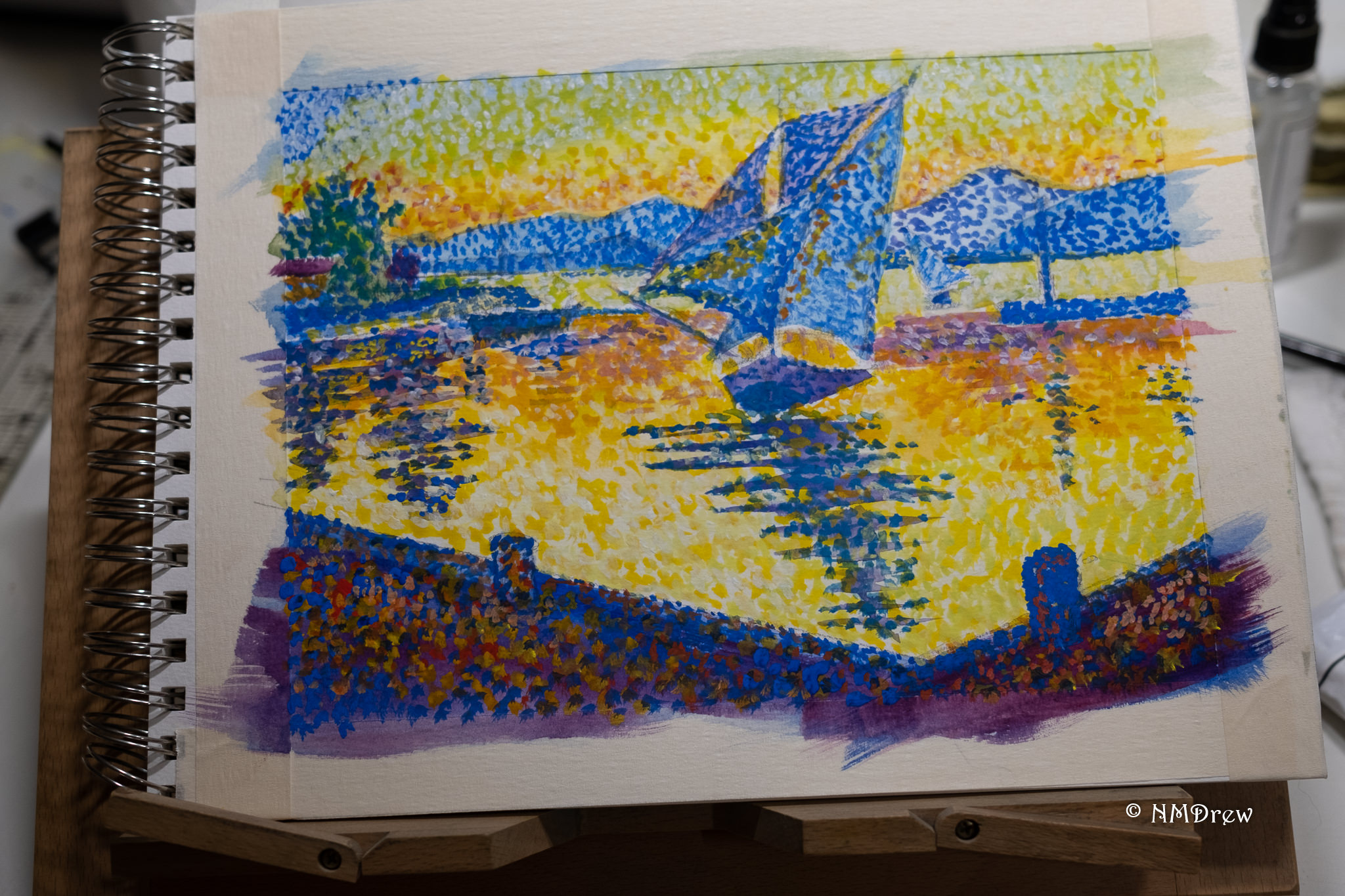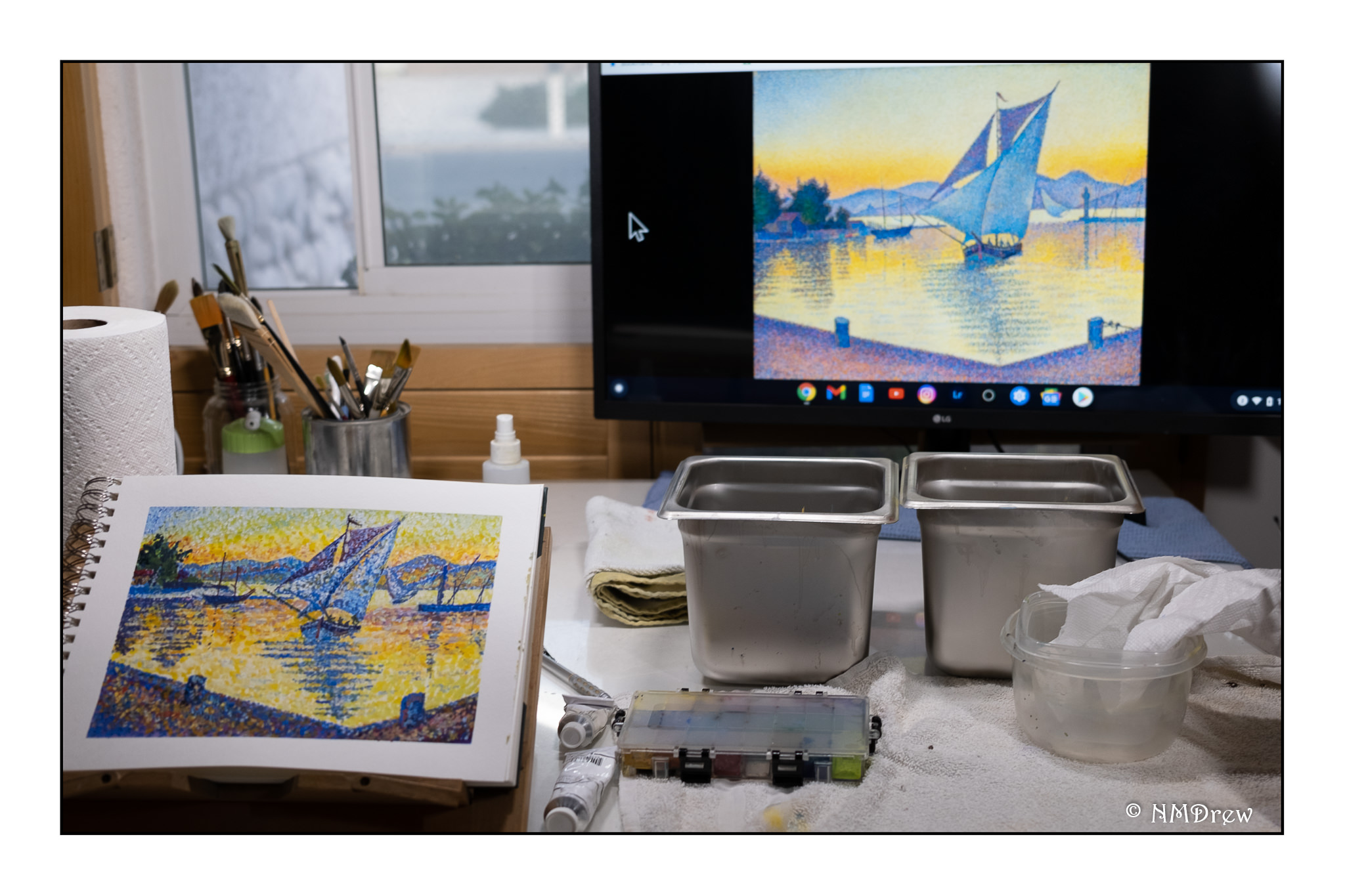 My own painting is more blue than Monet’s, but I saw a lot of blue in my reaction to his painting. Comparing the two is really interesting when I compare my scan to the Wikimedia online image presented here. It is hard work to get a good, warm grey and I did struggle with it. I also had to work on observing little things, such as the boats on the left middle edge – I couldn’t figure them out initially. The chimneys on the horizon also needed to be considered – what were they? The smoke on the left horizon gave it away. Once I had the boats on the left sorted, the vertical lines reflected in the water made a lot of sense.