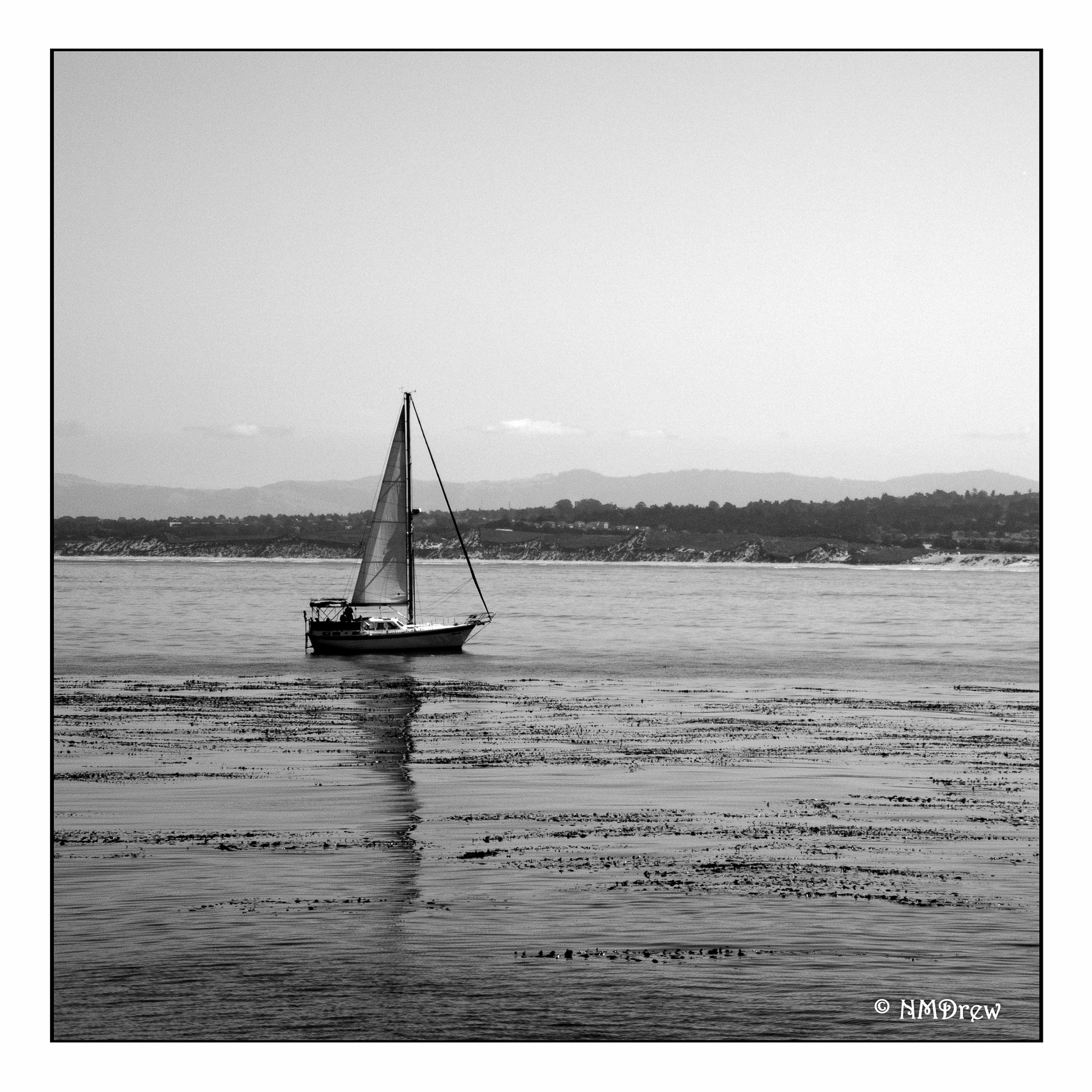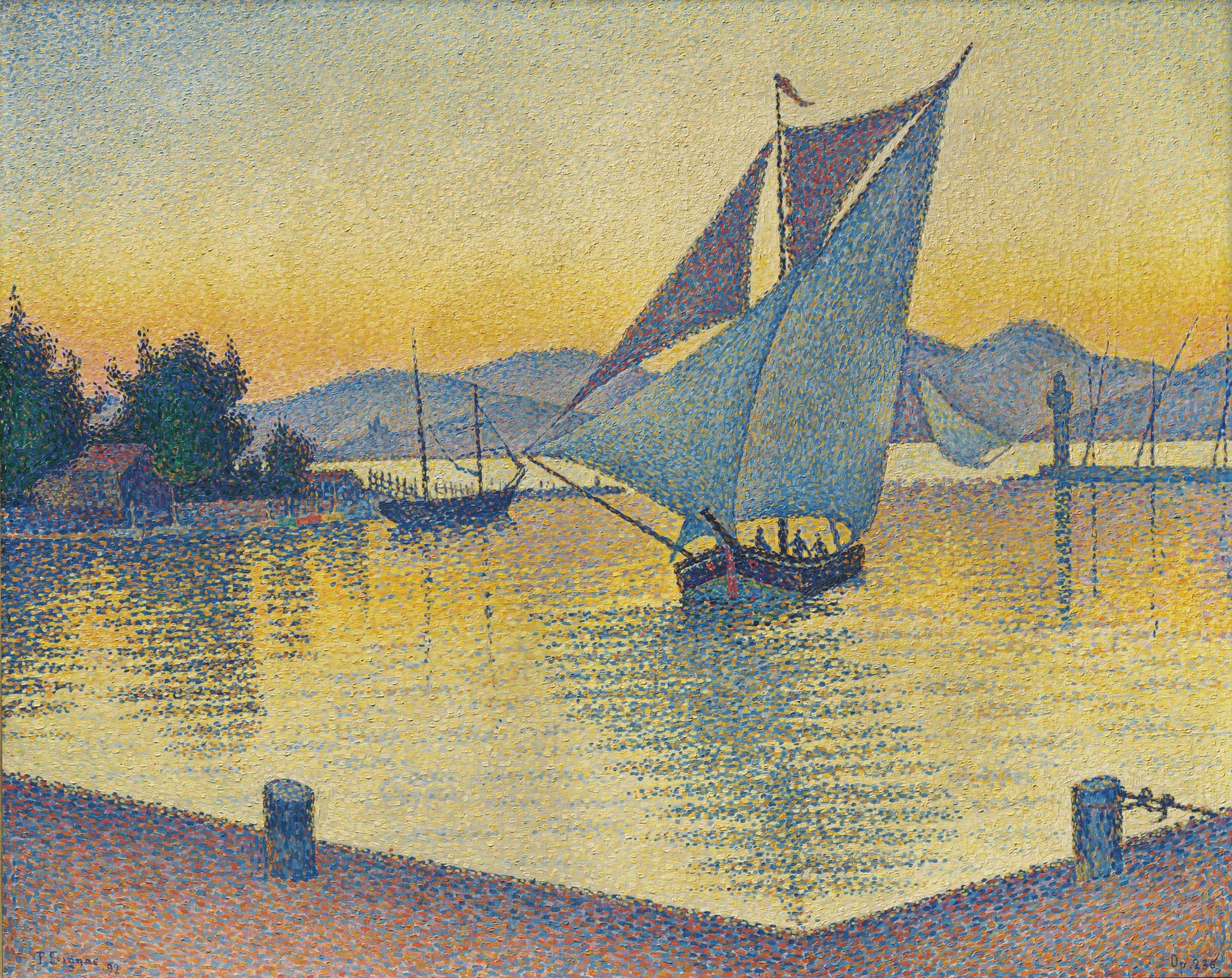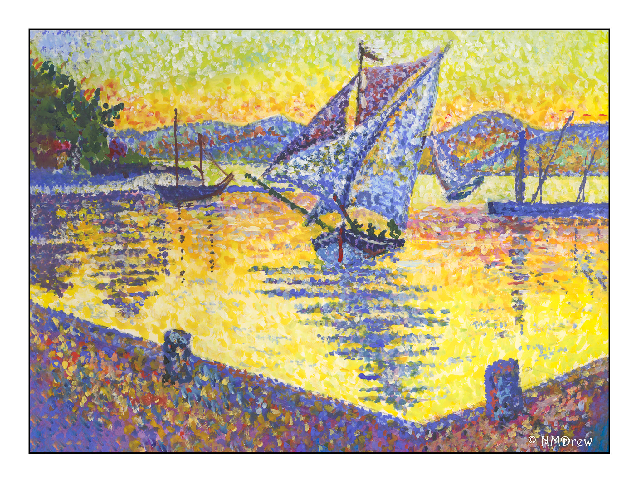 As I started to look more closely at Monet’s painting, I saw that his brushwork was very quick in many areas. The smudges of smoke in the left middle ground, the dark, wispy clouds used up a rather dry brush, one where paint was nearly gone. The white-blue swash across the sky seems like a quick thought. As well, it was interesting to see how the dark bits of clouds worked with the yellow and white areas to focus the viewer’s attention on the sailboat itself.