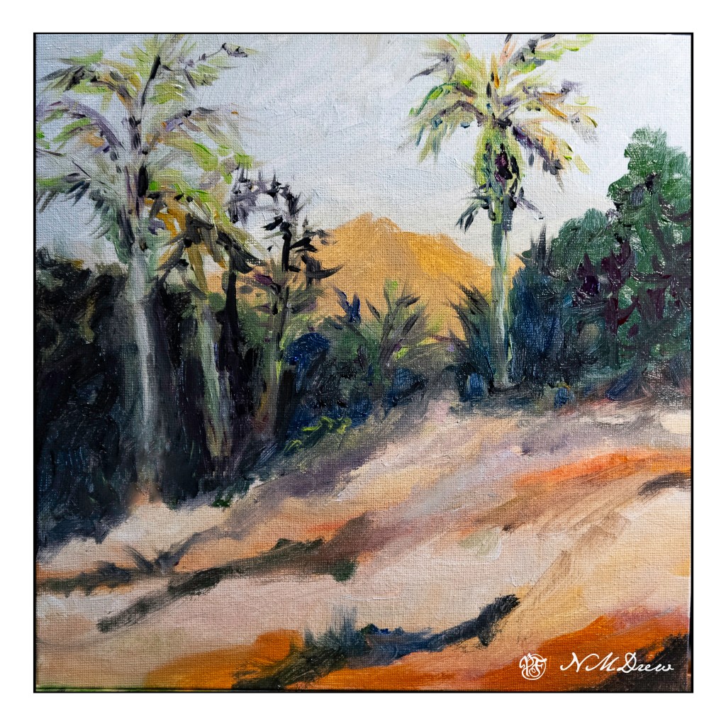 I am not really sure what to write about this painting. It is pretty simple. It is a simple scene of trees sits on the edge of a sandy bit of land and is backed by a few distant trees, grasses, and shrubs. The palette was simple enough. I worked to make my painting simple, too, and focused on shapes and contrast as well as recall of some lessons learnt from classes. I think it shows summer, too, and a bit of the sultriness I am feeling – humidity, heat, balmy. And very lazy.