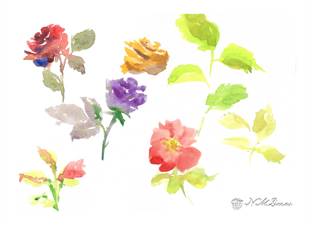 More roses – more C strokes – and then other kinds of strokes to make leaves. For the leaves, brush point on paper, squish down and move, bring brush up to another point. Just as in sumi-e! Then, while the paper and paint are still wet, take the tip of the brush and create little points around the outer edge of each leaf. Some roses have pointy leaf edges, others do not. I don’t think the Rose Police will come knocking on my door, though, so I am safe.