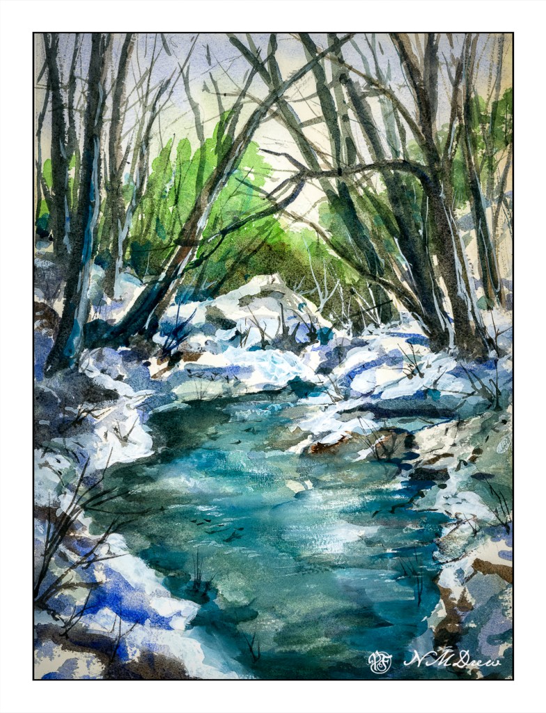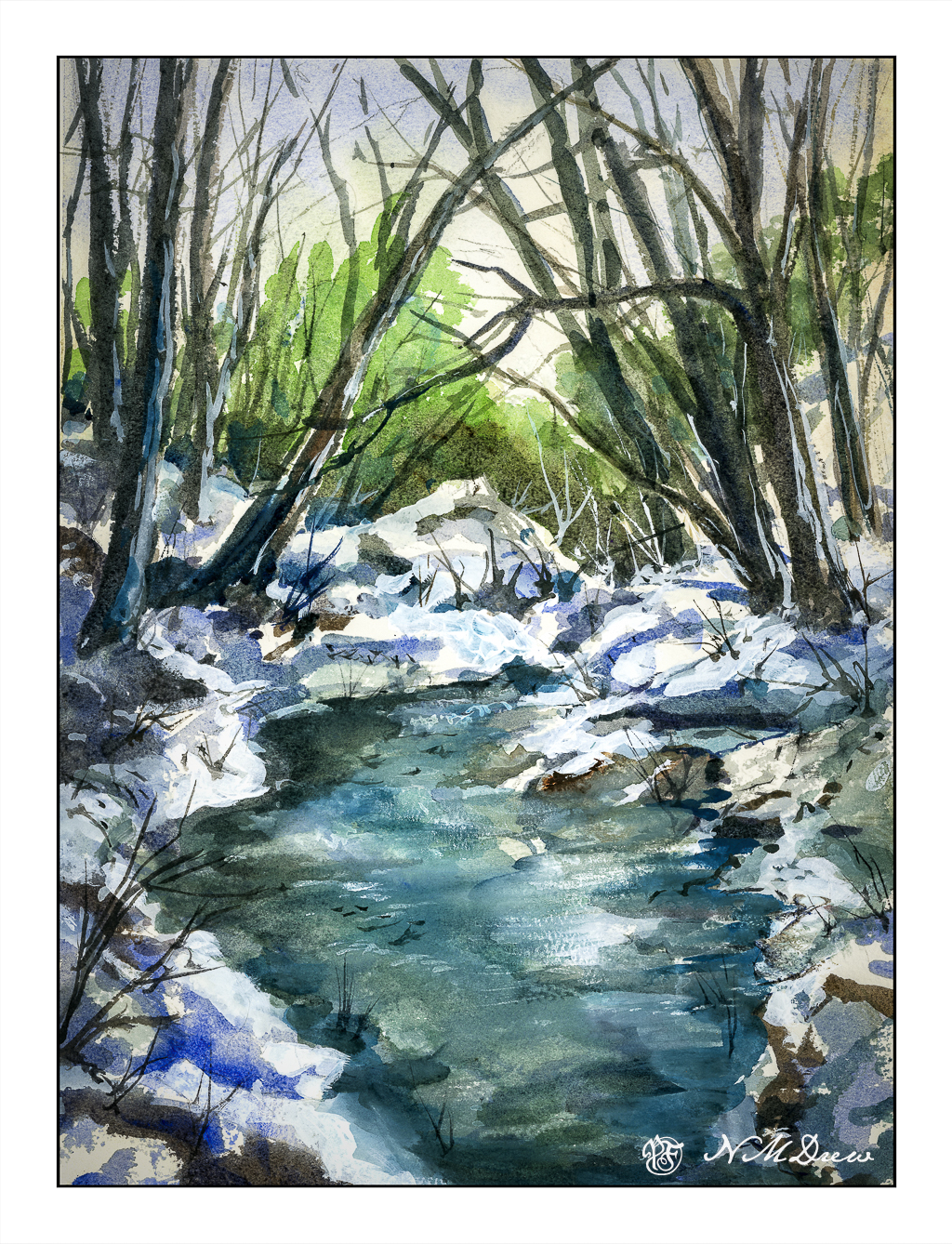 Probably most of my memories come from upstate New York. No place that I have visited does winter quite like the mixed hardwood and pine forests. Bright green, dark green, barren branches, tall trees. Skies can be sunny and fierce, dull and overcast, and everything in between. Water, whether lake or stream, takes on its own life when frozen, thawed or in between. It still amazes me that fish swim under the ice and amphibians bury themselves in the mud until spring comes.